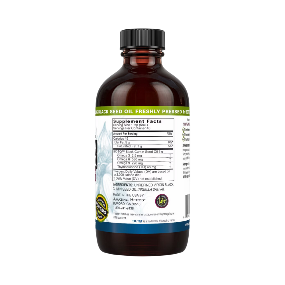 Premium Black Seed Oil by Amazing Herbs is a 100% pure cold-pressed Black Seed oil made from black cumin seed from Turkey and comes with a dropper for easy application. It’s loaded with multiple Omega fatty acids associated with the growth and development of the body. They also play an essential role in promoting better brain health and improving memory. When you buy black cumin seed oil from Amazing Herbs you get the highest quality premium Turkish Nigella sativa formulation.
