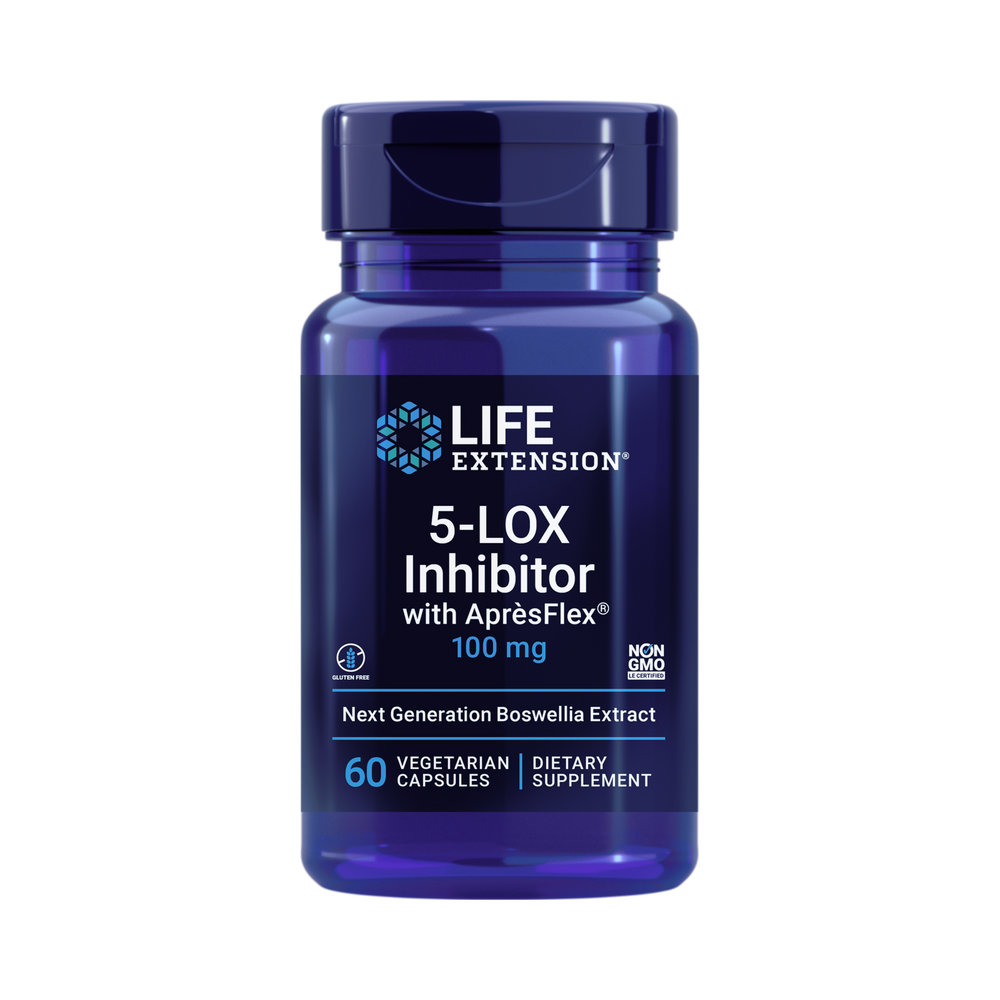 Compounds in Boswellia extract have been shown to bind directly to 5-LOX, an enzyme that transforms fatty acids into inflammatory factors like leukotriene B4. A compound in boswellia called AKBA is the key to this beneficial action. Each 100 mg vegetarian capsule of 5-LOX Inhibitor with AprèsFlex® is standardized to provide 20% of active AKBA from boswellia.