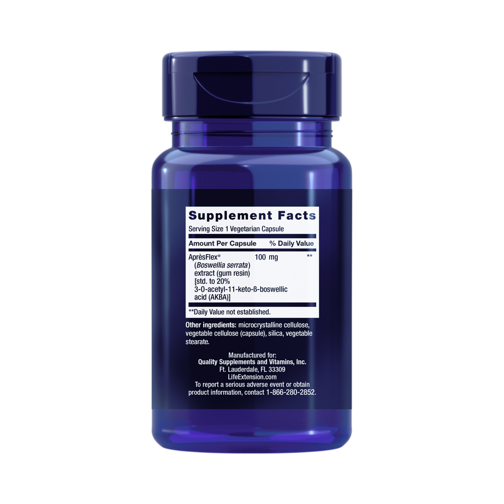 Each 100 mg vegetarian capsule of 5-LOX Inhibitor with ApresFlex® is standardized to provide 20% of active AKBA from boswellia. Most people need only one capsule a day.
