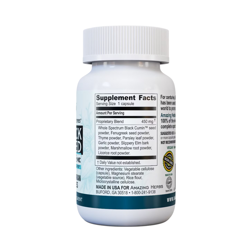 | Proprietary Blend Whole Spectrum Black Cumin™ seed powder, Fenugreek seed powder, Thyme powder, Parsley leaf powder, Garlic powder, Marshmallow root powder, Licorice root powder. |
