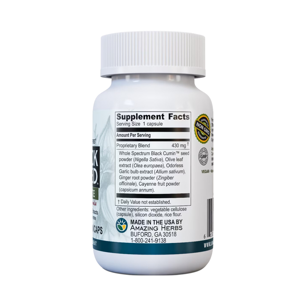 Amazing Herbs designed a potent combination of Black Cumin Seeds with Olive oil, Garlic, Ginger, and Cayenne to deliver various health benefits. Our Whole Spectrum™ Black Seed ULTIMATE Defense formula is specifically formulated for individuals looking for better life quality and an all-in-one immunomodulatory supplement. This special combination significantly optimizes cardiovascular function, promotes digestive health, and preserves lung integrity, thereby boosting general health and wellbeing. Additionally, this formulation delivers potent bioactive compounds that possess antioxidant, anti-inflammatory, and antimicrobial activities.