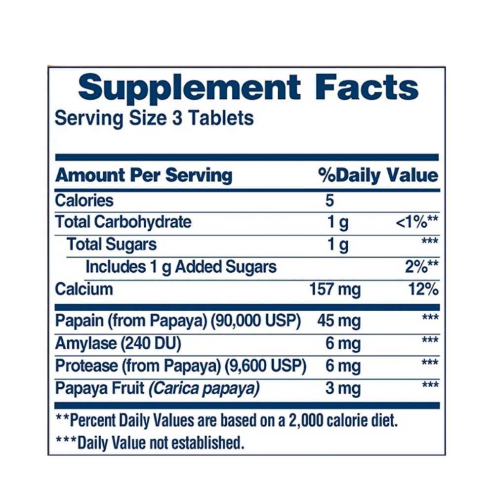 A Naturally-Sourced Digestive Aid; Contains freshly ripened papaya fruit with papain, amylase & protease enzymes, which aid in the digestion of proteins and carbohydrates