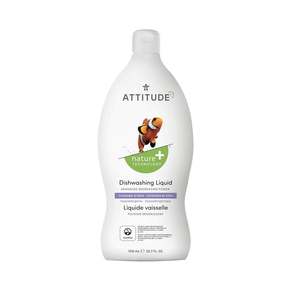 ATTITUDE dishwashing liquid with captivating fruity and wooded coriander & olive aroma is your new home essential. Its strong degreasing power with foaming action eliminates grease and residue. Its aromatic blend of coriander and olives evokes the scent of fresh herbs and creates a Mediterranean ambiance. This dishwashing liquid comes in a bottle made from HDPE #2 plastic—the easiest plastic to recycle—and can be reused again and again thanks to our innovative eco-refills. Its EWG VERIFIED, vegan and cruelty-free formula leaves your dishes clean and sparkling every day.