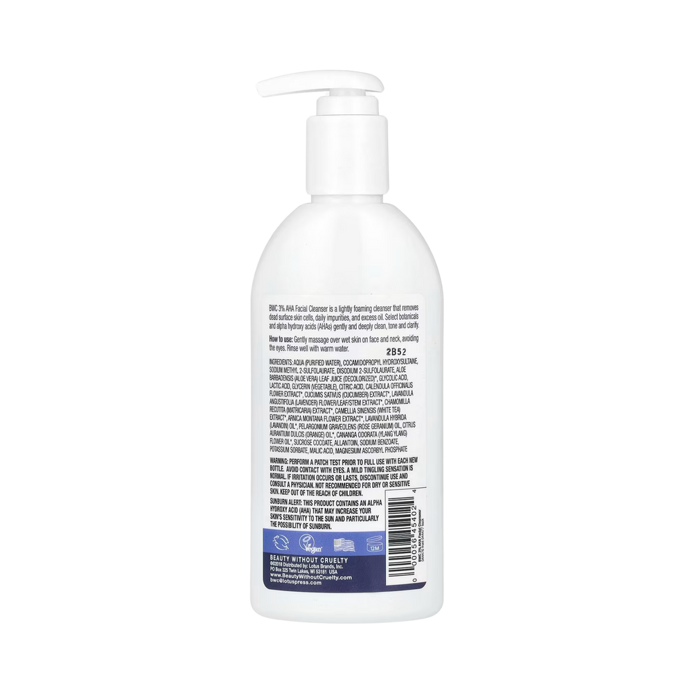 BWC 3% AHA Facial Cleanser is a lightly foaming cleanser that removes dead surface skin cells, daily impurities, and excess oil. Select botanicals and alpha hydroxy acid (AHAs) gently and deeply clean, tone and clarity.