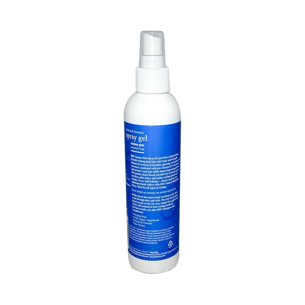 Beauty Without Cruelty Volume Plus Spray Gel Directions Spray fine mist evenly on damp or dry hair, gently comb through and style. The convenient spray disperses gel evenly for easy, tangle-free application. Great with natural or heat styling methods. For best results, use after BWC Shampoo and Conditioner. Ingredients: Botanical extracts of lavender, ginseng, cucumber, and rosemary, pvp/va copolymer, panthenol (pro vitamin B-5), allantoin, sodium pca (natural moisturizer), soy protein, xanthan gum (natural thickener), aloe vera gel, vegetable glycerin, phenoxyethanol, benzyl alcohol, potassium sorbate, citric acid (from citrus fruit).
