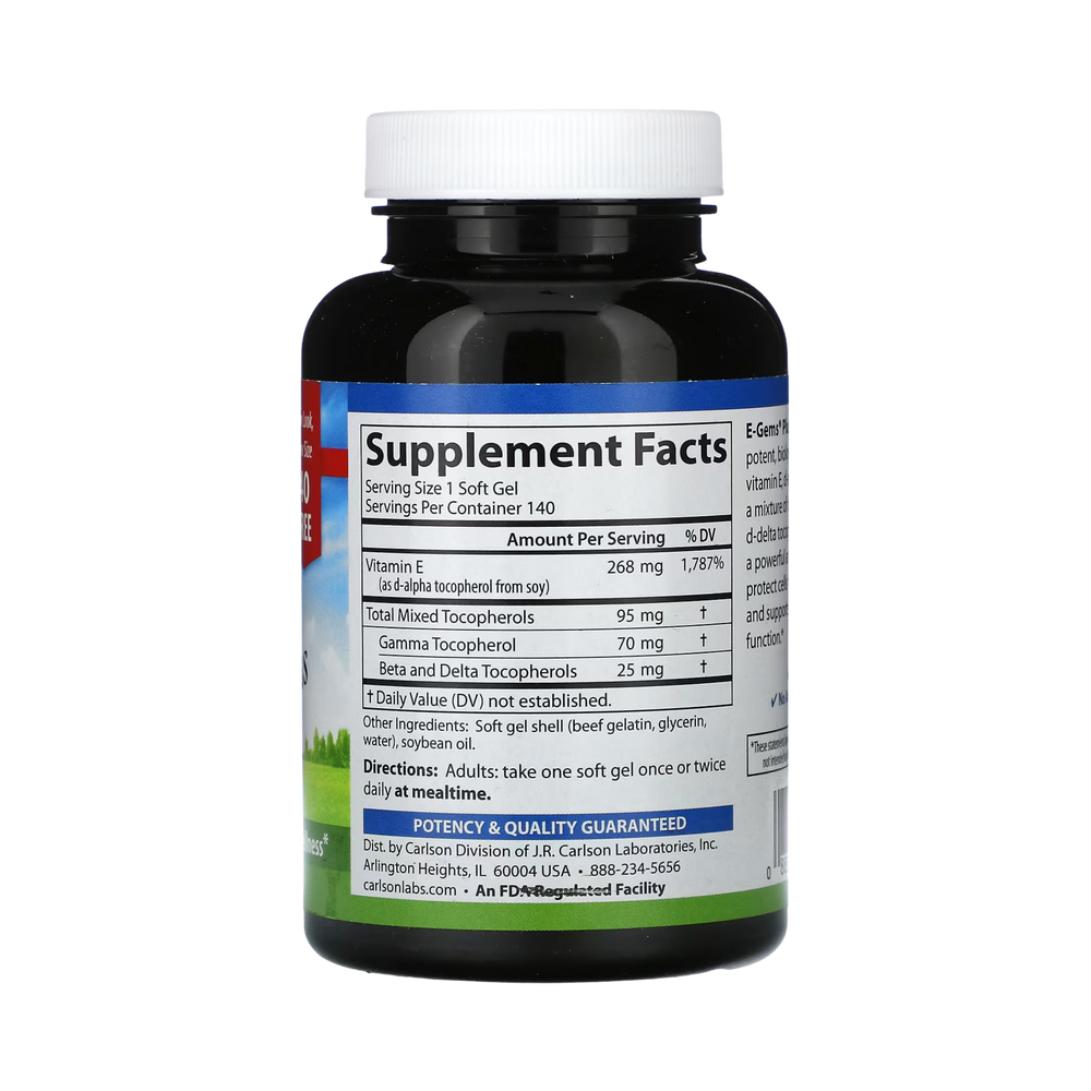 E-Gems® Plus provides the most potent, biologically active form of vitamin E, d-alpha tocopherol, plus a mixture of d-beta, d-gamma, and d-delta tocopherols. Vitamin E is a powerful antioxidant that helps protect cells from free radical damage and supports healthy cardiovascular function .