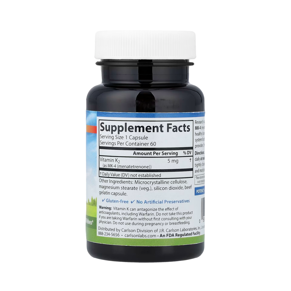 Research suggests that vitamin K2 as MK-4 (menatetrenone) promotes healthy bones and cardiovascular system function. A single capsule provides 5 mg of MK-4.