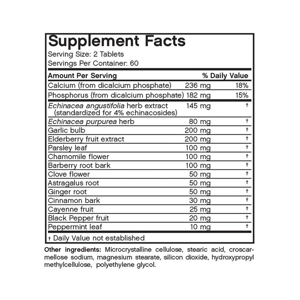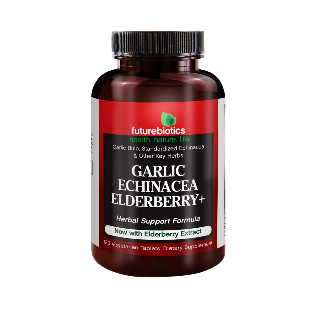 Futurebiotics Garlic, Echinacea & Elderberry+ is an immune support supplement that has been specially formulated with well-known immune-boosting herbs. Garlic, Echinacea and Elderberry have all been used for centuries as a natural remedy and protection from immune weaknesses. Garlic has been historically used as a traditional folk remedy, while Echinacea has been a long-trusted herb used to boost your body's immune system. Elderberry has been known to support the body’s natural defenses. This powerful combination has been shown to provide important immune support and is ideal for seasonal changes. These powerful ingredients can be hard to obtain enough of through our regular diet, making our immune-boosting supplement ideal for those with busy lives. Take two tablets up to two times a day, particularly during seasonal changes to support a strong immune system.