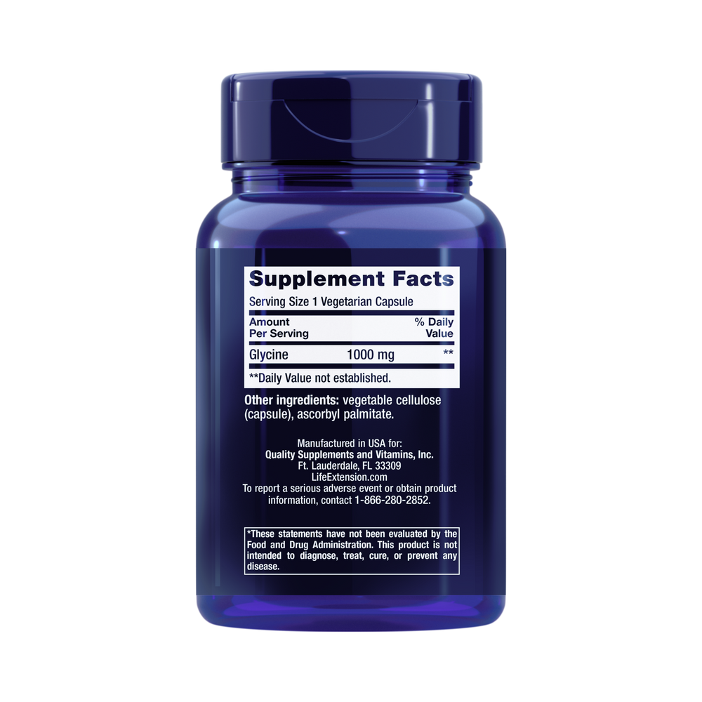 In addition to its many and varied benefits, glycine has a strong safety record. Most people need to take between one to three grams of glycine to experience benefits. As a result, using low dose capsules can be cumbersome and expensive. Life Extension’s glycine comes in easy-to-swallow 1000-mg capsules.