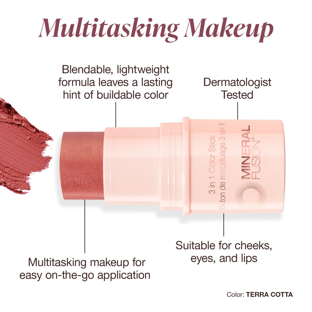 The all-in-one color go-to. Mineral Fusion 3-in-1 Color Stick is a lip tint, cheek tint, and eyelid color pop in one super easy twist tube to streamline your makeup routine. Just pat on with fingertips throughout the day for a subtle shimmer and glow.