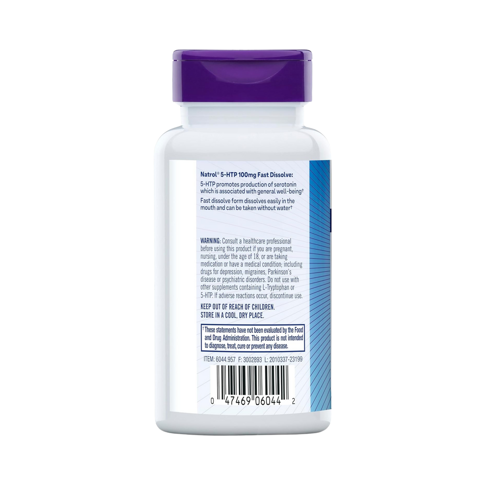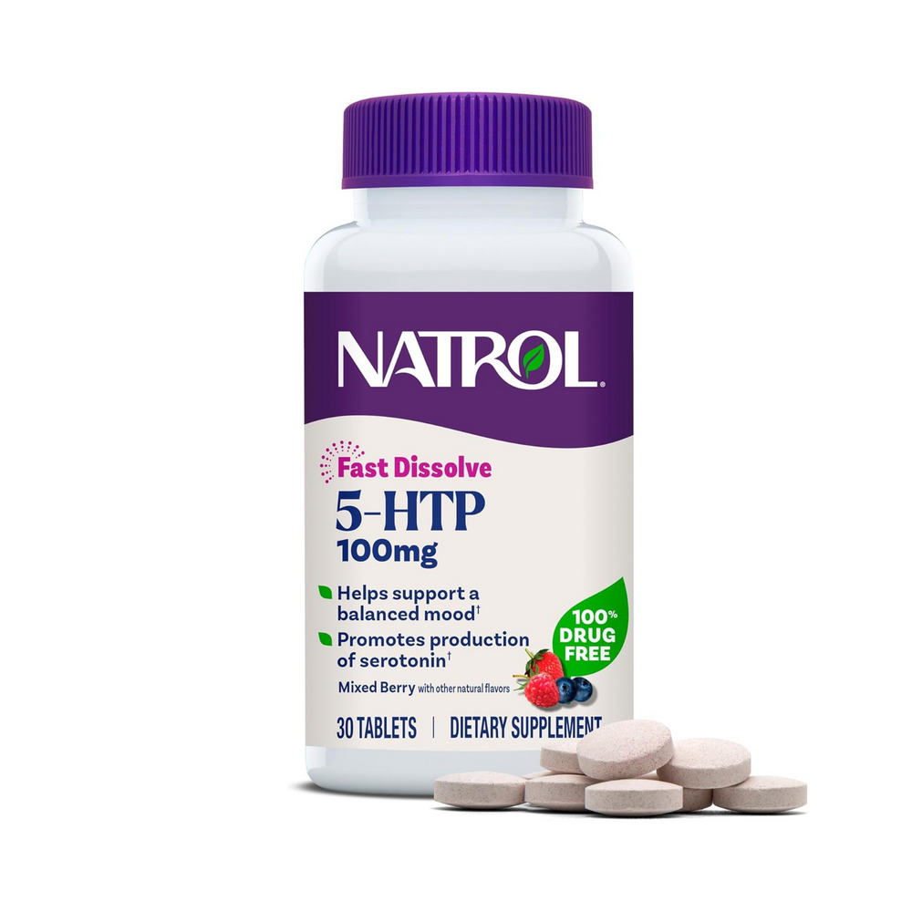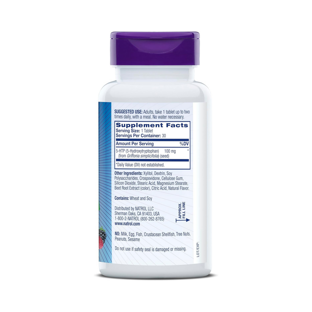Natrol 5-HTP 100 mg fast dissolve helps support a balanced mood and promotes production of serotonin.(1) 5-HTP supplement promotes production of serotonin which is associated with general well-being.(1) With a delicious mixed berry flavor and a fast dissolve form, this dietary supplement dissolves easily in the mouth and can be taken without water. It does not contain milk, egg, fish, crustacean shellfish, tree nuts, peanuts or sesame; contains wheat and soy. Suggested Use: Adults, take one tablet up to two times daily with a meal. No water necessary. Natrol is dedicated to creating innovative, quality products, to help you maintain good health and thrive in your busy, modern lifestyle. (1)These statements have not been evaluated by the Food and drug administration. This product is not intended to diagnose, treat, cure or prevent any disease. (2)Nielsen, xAOC, 52 weeks ending 04/26/25, Sleep Aid Supplements