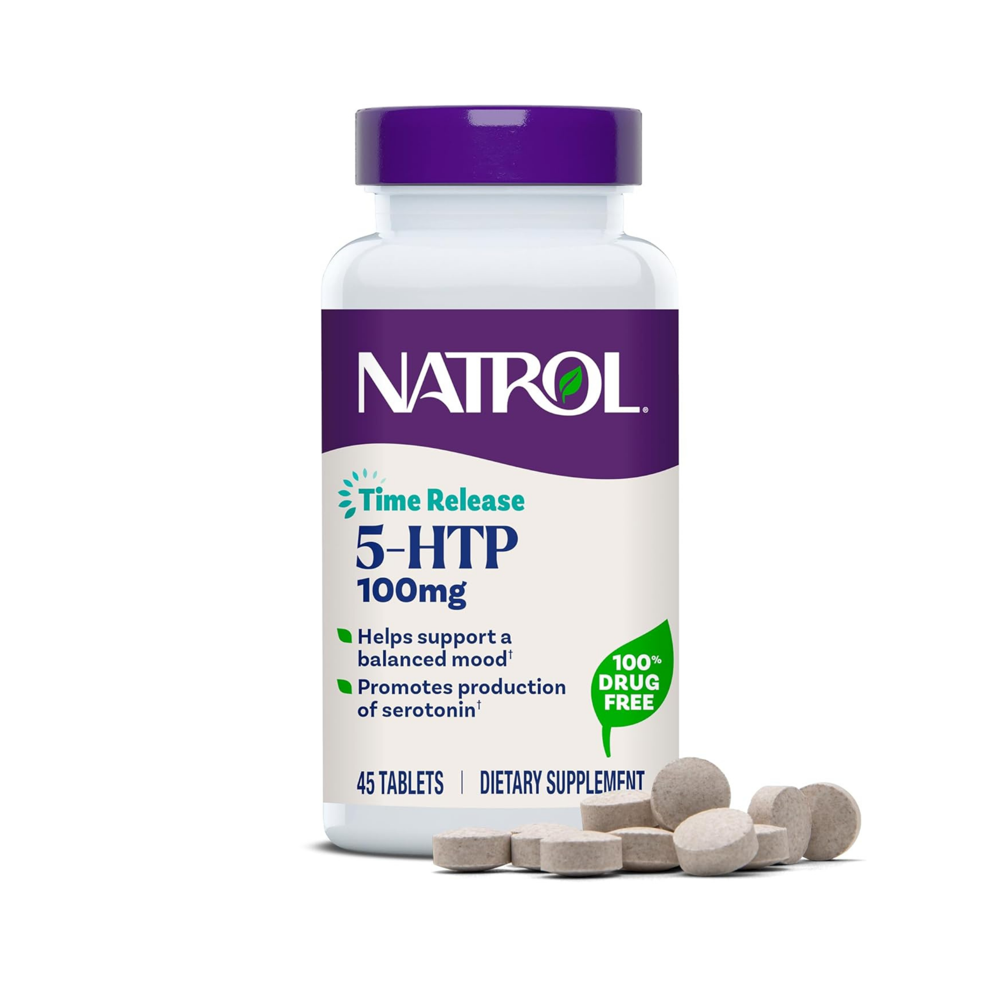 Natrol® 5-HTP 100 mg Time Release: Controlled release tablet releases 5-HTP slowly to help support a balanced mood and promote production of serotonin throughout the day.