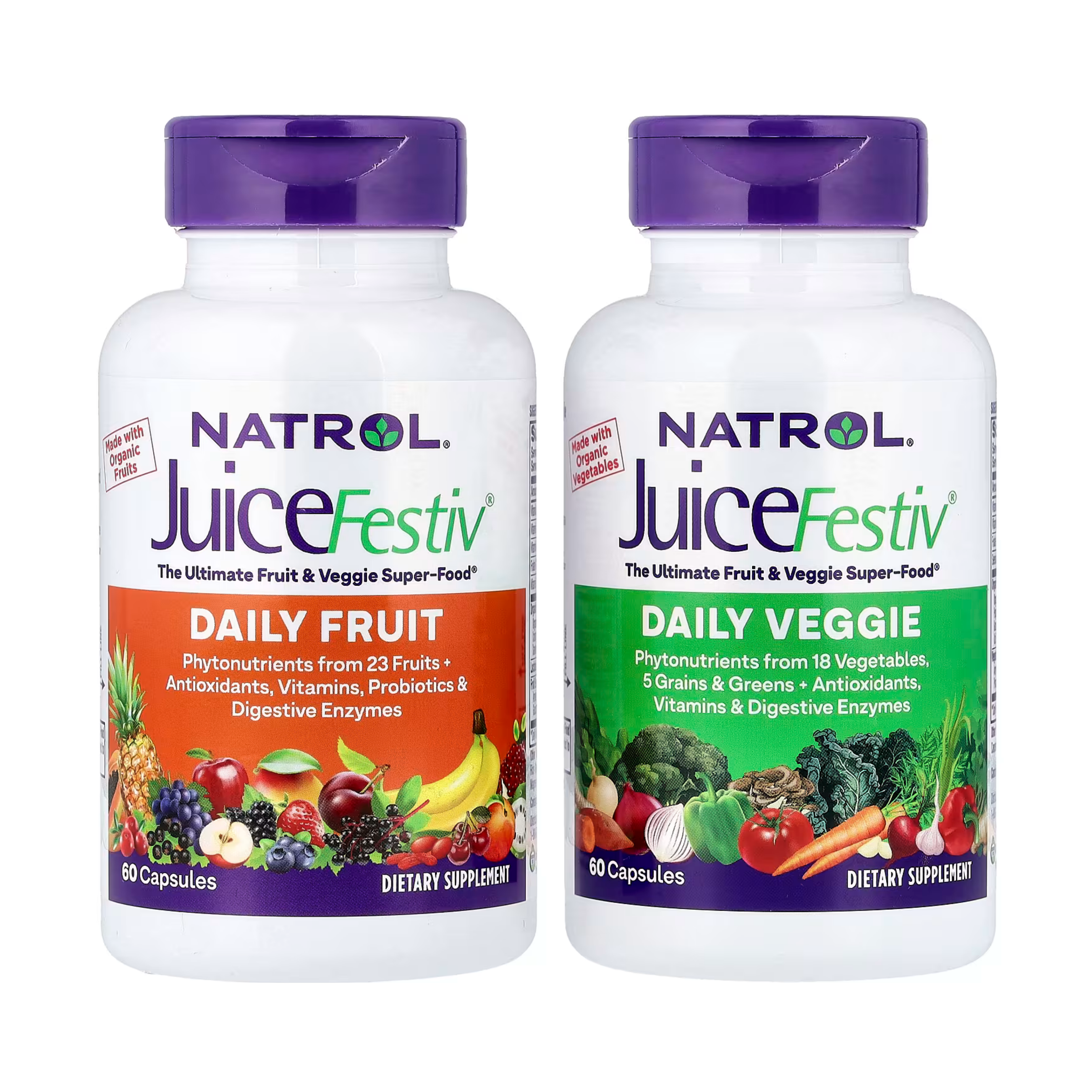 Natrol JuiceFestiv, the ultimate fruit and veggie super-food, is the simple and convenient way to provide your family with key nutrients to support a healthy and active lifestyle.(1) Made with organic fruits and vegetables and filled with probiotics and digestive enzymes, these super fruit and veggie supplements support balanced nutrition and overall well-being.(1) Colorful fruits and vegetables like spirulina, wheat grass and goji berry in these fruit and vegetable capsules provide a spectrum of antioxidants.(1) Antioxidants in these super fruits and veggie capsules fight free radicals in the body and reduce oxidative stress for cellular health.(1) These green superfood capsules contain no egg, fish, crustacean shellfish, tree nuts, peanuts or sesame. Suggested Use: Adults, take two capsules of Daily Fruit and two capsules of Daily Veggie with any meal. Natrol is dedicated to creating innovative, quality products, to help you maintain good health and thrive in your busy, modern lifestyle. (1)These statements have not been evaluated by the Food and drug administration. This product is not intended to diagnose, treat, cure or prevent any disease. (2)Nielsen, xAOC, 52 weeks ending 1/25/25, Sleep Aid Supplements.