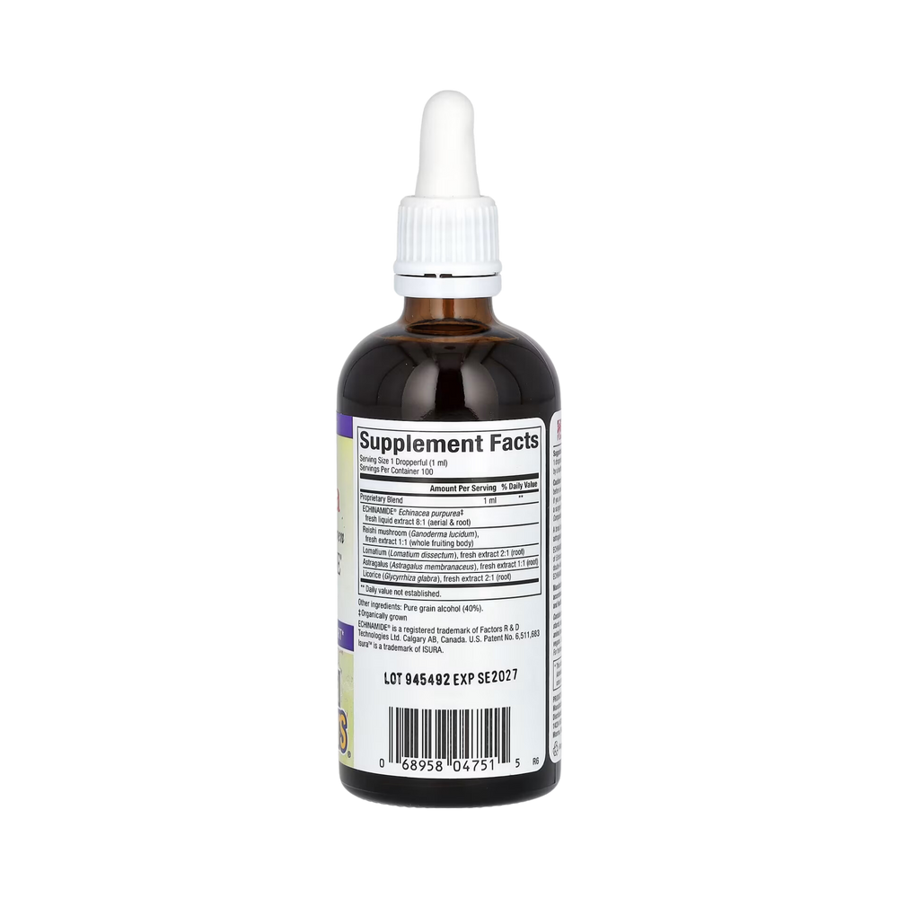 | Proprietary Blend ECHINAMIDE® Echinacea purpurea‡ fresh liquid extract 8:1 (aerial & root) Reishi mushroom (Ganoderma lucidum), fresh extract 1:1 (whole fruiting body) Lomatium (Lomatium dissectum), fresh extract 2:1 (root) Astragalus (Astragalus membranaceus), fresh extract 1:1 (root) Licorice (Glycyrrhiza glabra), fresh extract 2:1 (root) |