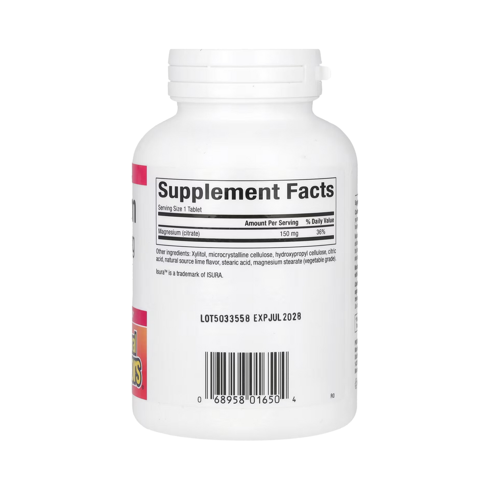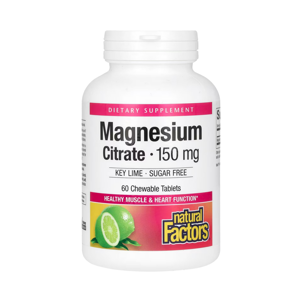 Natural Factors Magnesium features 150 mg of bioavailable magnesium citrate in a delicious sugar-free key lime chewable tablet. Magnesium is an essential mineral that is needed for more than 300 enzymatic reactions in the body. It is important for sleep and relaxation, muscle repair and bone health, and bowel regularity.