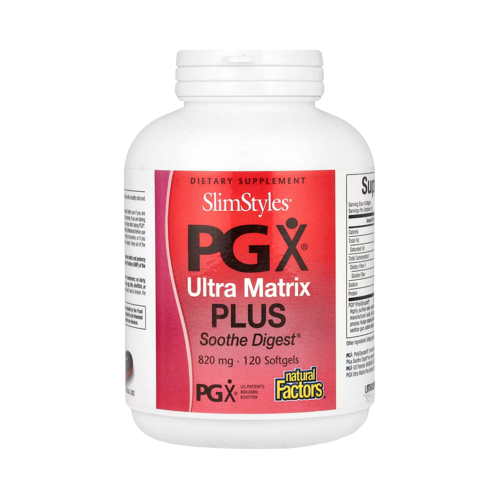 SlimStyles® PGX Ultra Matrix Plus Soothe Digest® supports healthy weight loss and overall good health.†PGX® slows the digestion of your meals, which keeps you feeling full and satisfied for longer. This feeling of fullness helps reduce between-meal and evening food cravings and helps you feel satisfied with smaller portions during meals. The formula contains Soothe Digest, a herbal blend that provides support for occasional indigestion discomfort such as gas and bloating. The carminative action of these herbs soothes the gastrointestinal tract and helps promote digestion.
