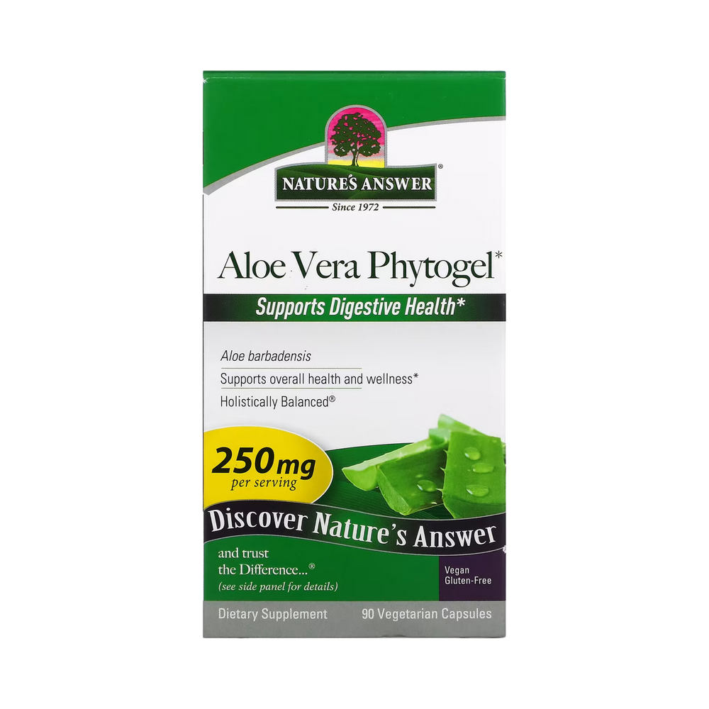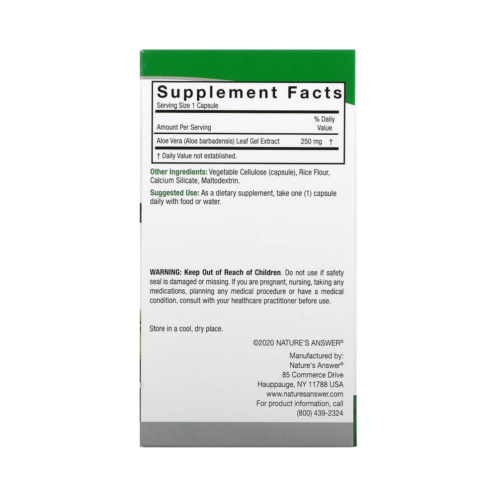 Nature’s Answer Aloe Vera Capsules are unique. Each highly concentrated 250 mg. vegetarian capsule is equivalent to 1 ounce of pure Aloe Vera whole inner leaf gel.