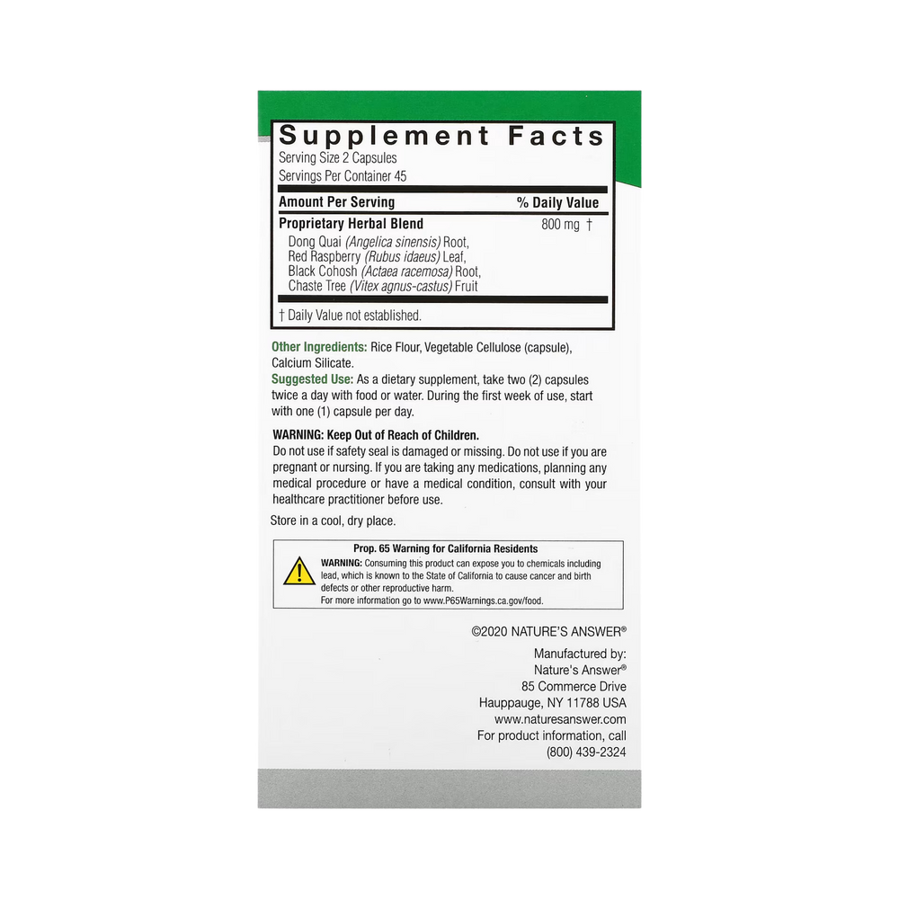 Dong Quai (Angelica sinensis) Root, Red Raspberry (Rubus idaeus) Leaf, Black Cohosh (Actaea racemosa) Root, Chaste Tree (Vitex agnus-castus) Fruit