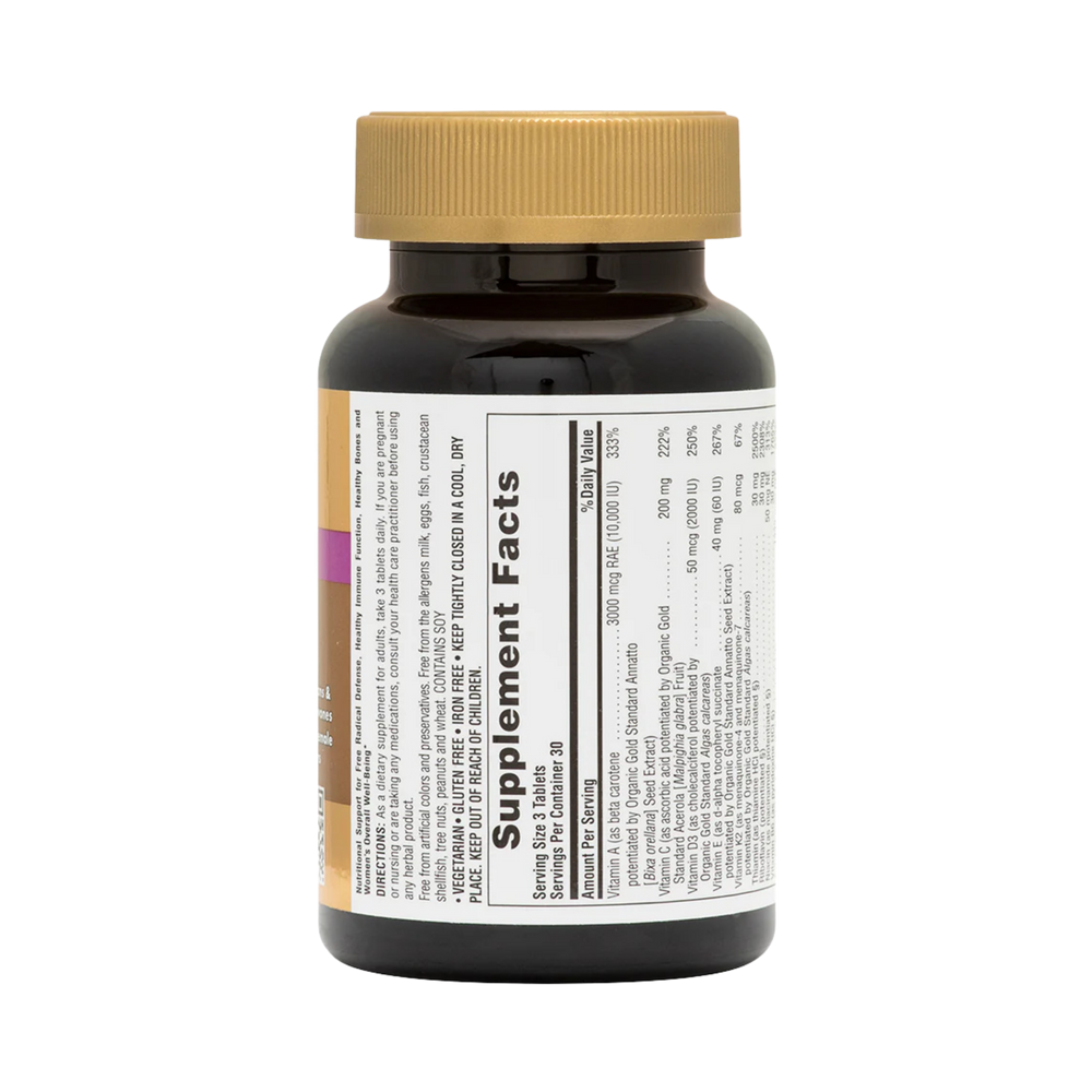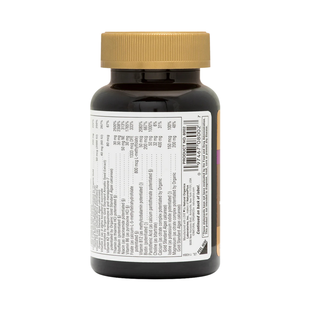 Vitamin A (as beta carotene potentiated by Organic Gold Standard Annatto [Bixa orellana] Seed Extract), Vitamin C (as ascorbic acid potentiated by Organic Gold Standard Acerola [Malpighia glabra] Fruit), Vitamin D (as cholecalciferol [D3] potentiated), Vitamin E (as d-alpha tocopheryl succinate potentiated by Organic Gold Standard Annatto Seed Extract), Vitamin K (as menaquinone-7 and menaquinone-4 [K2] potentiated), Thiamin (as thiamine HCI potentiated), Riboflavin (potentiated), Niacin (as niacinamide potentiated), Vitamin B6 (as pyridoxine HCI), Folate (as calcium-L-5-methyltetrahydrofolate potentiated), Vitamin B12 (as methylcobalamin potentiated), Biotin (potentiated), Pantothenic Acid (as calcium pantothenate potentiated), Choline (as bitartrate), Calcium (as citrate complex potentiated), Iodine (as potassium iodide potentiated), Magnesium (as citrate complex potentiated), Zinc (as citrate potentiated by Organic Gold Standard Guava), Selenium (as selenomethionine potentiated), Copper (as citrate potentiated), Manganese (as gluconate potentiated), Chromium (as polynicotinate potentiated by Organic Gold Standard Moringa Extract [Moringa oleifera]), Molybdenum (as sodium molybdate potentiated)