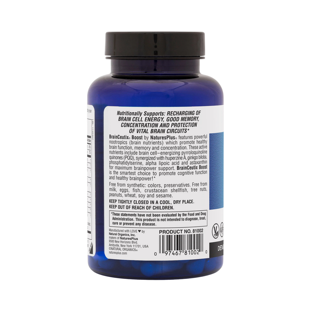 BrainCeutix® Boost by Nature's Plus® features powerful nootropics (brain nutrients) which promote healthy brain function, memory and concentration. These active nutrients include brain-cell energizing pyrroloquinoline quinones (PQQ), synergized with huperzine A, ginkgo biloba, phosphatidylserine, alpha lipoic acid and astaxanthin for maximum brainpower support. BrainCeutix is the smartest choice to promote cognitive function and healthy brainpower!