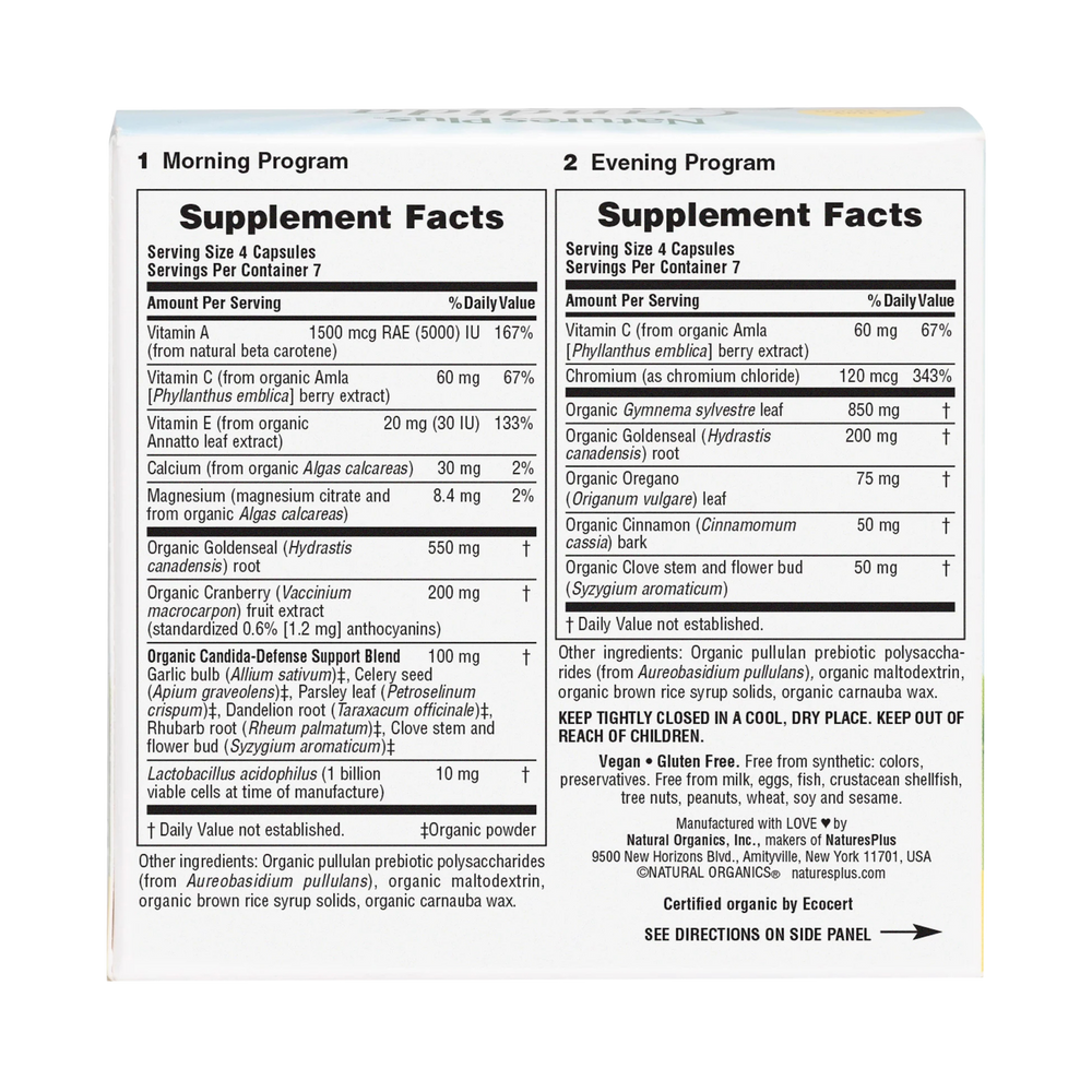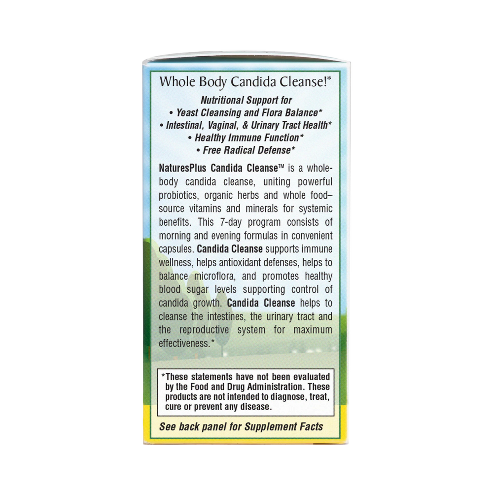 NaturesPlus Candida Cleanse™ is a whole-body candida cleanse, uniting powerful probiotics, organic herbs and whole food-source vitamins and minerals for systemic benefits. This 7-day program consists of morning and evening formulas in convenient capsules. Candida Cleanse supports immune wellness, improves antioxidant defenses, helps to balance microflora, and helps eliminate the conditions (such as excessive sugar) that aid candida growth. Candida Cleanse specifically helps to cleanse the intestines, the urinary tract and the reproductive tract for maximum effectiveness.