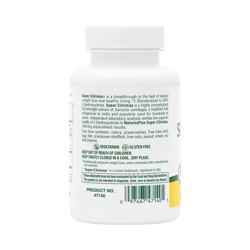 Super Citrimax® is a breakthrough in the field of natural weight loss and healthy living.*‡ Standardized to 50% [-]hydroxycitrate, Super Citrimax is a highly concentrated, full-strength extract of Garcinia cambogia, a healthful fruit indigenous to India and popularly used for hundreds of years. Independent laboratory analysis verifies the superior quality of [-]hydroxycitrate in NaturesPlus Super Citrimax, offering unparalleled results.