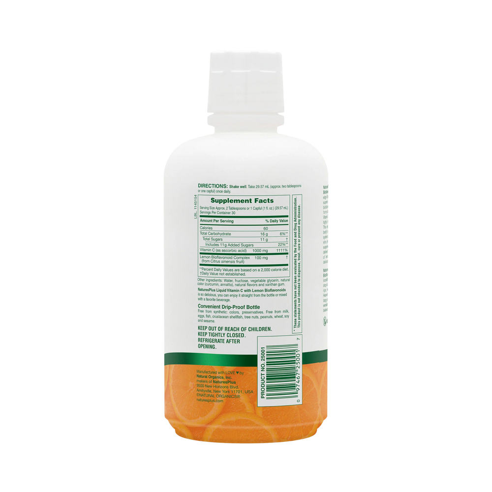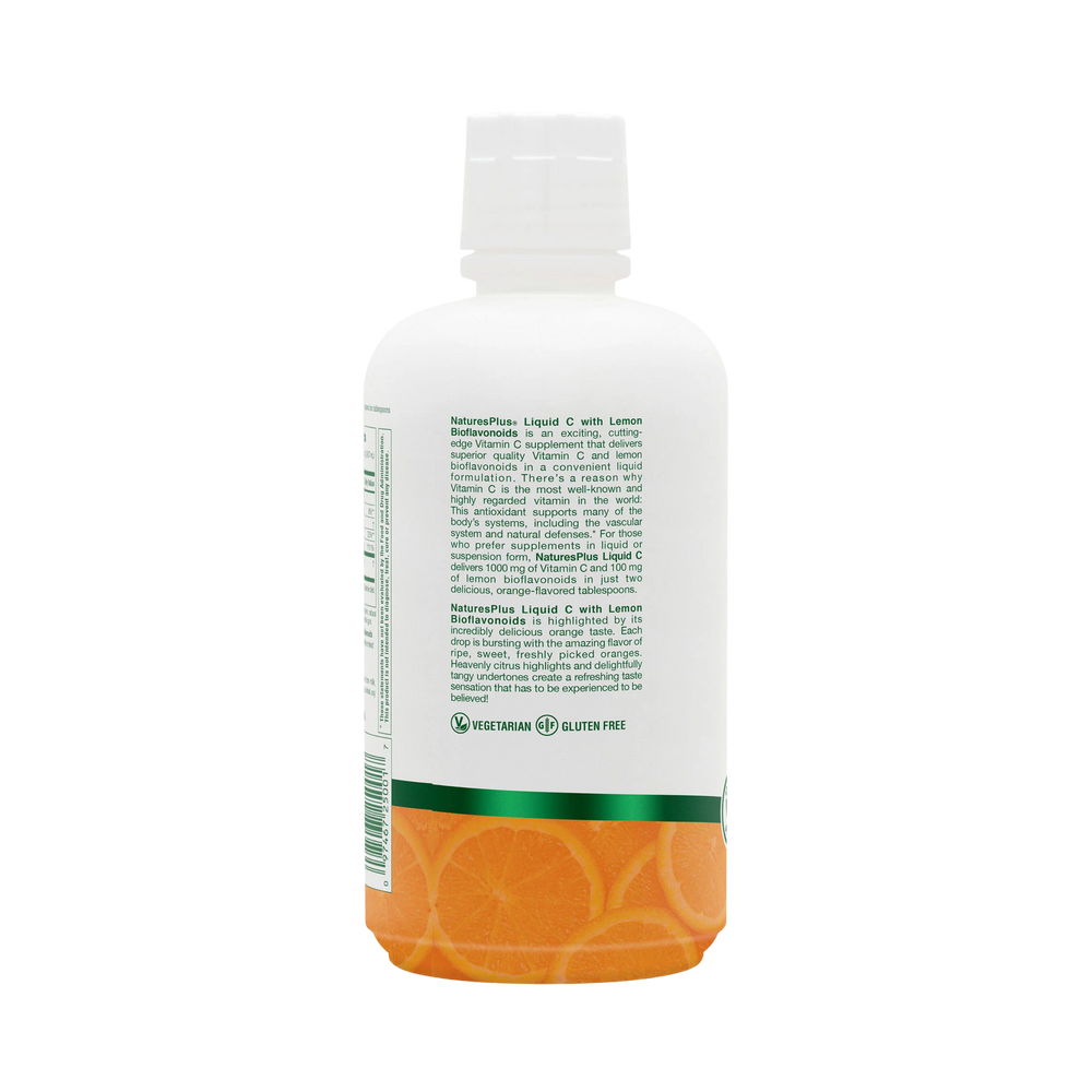 NaturesPlus® Liquid C with Lemon Bioflavonoids is an exciting, cutting-edge Vitamin C supplement that delivers superior quality Vitamin C and lemon bioflavonoids in a convenient liquid formulation. There's a reason why Vitamin C is the most well-known and highly regarded vitamin in the world: This antioxidant supports many of body's systems, including the vascular system and natural defenses. For those who prefer supplements in liquid or suspension form, Nature's Plus Liquid C delivers 1000 mg of Vitamin C and 100 mg of lemon bioflavonoids in just two delicious, orange flavored tablespoons.