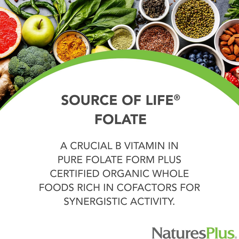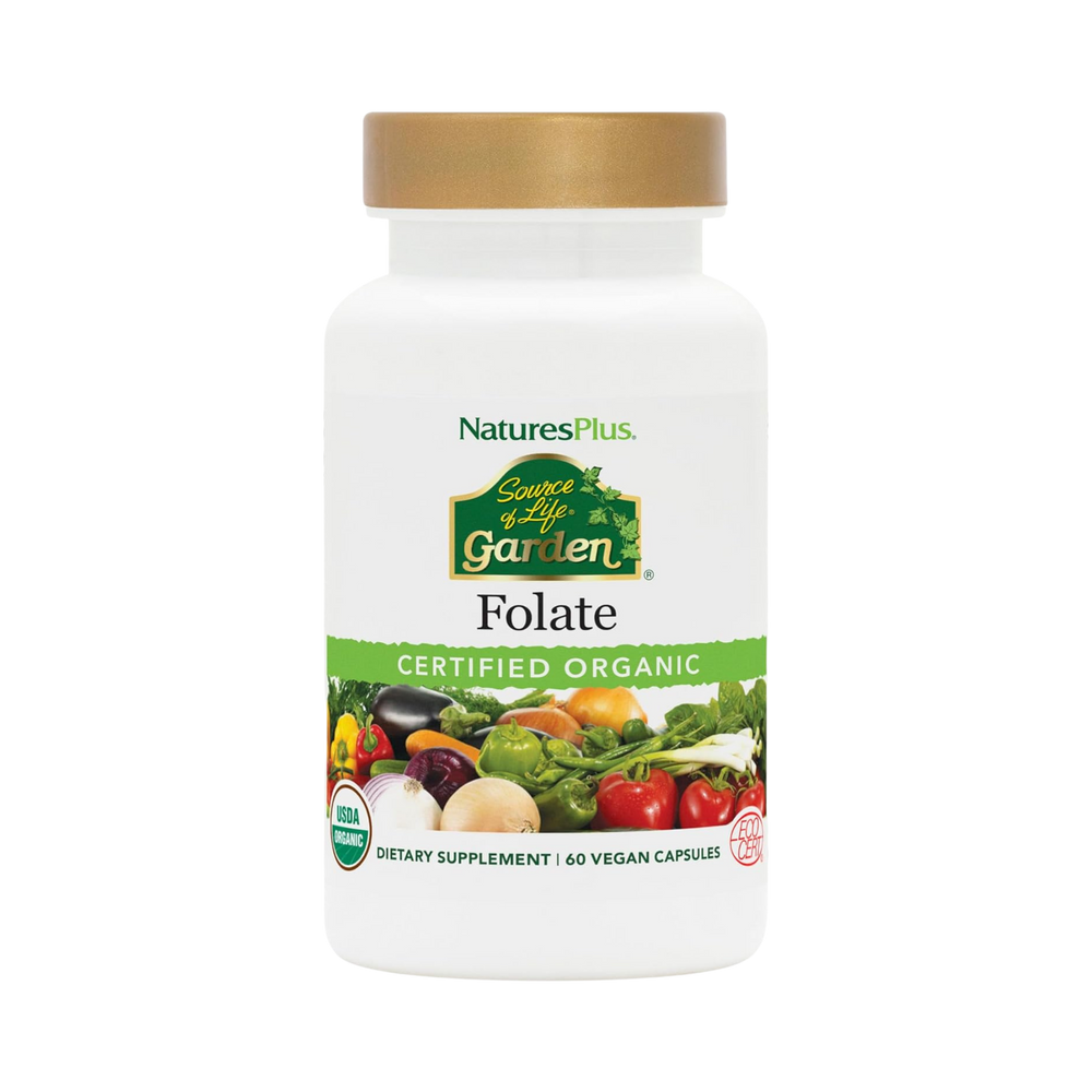 NaturesPlus® Source of Life® Garden Folate delivers this essential water-soluble vitamin in a Certified Organic 400 mcg DFE potency per serving.