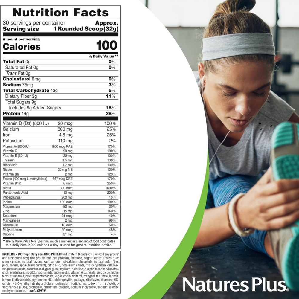 Vitamin D (D3), Calcium, Iron, Potassium, Vitamin A, Vitamin C, Vitamin E, Thiamin, Riboflavin, Niacin, Vitamin B6, Folate (folic acid), Vitamin B12, Biotin, Pantothenic Acid, Phosphorus, Iodine, Magnesium, Zinc, Selenium, Manganese, Chromium, Molybdenum, Choline, Ingredients: Proprietary non-GMO Plant-Based Protein Blend (soy [isolated soy protein and fermented soy], pea protein and rice protein), fructose, oligofructose, freeze-dried cherry pieces, natural flavors, xanthan gum, di-calcium phosphate, natural color (beet juice, radish, apple, black currant), citric acid, potassium citrate, microcrystalline cellulose, magnesium oxide, ascorbic acid, guar gum, psyllium, spirulina, d-alpha tocopheryl acetate, choline bitartrate, inositol, niacinamide, apple pectin, vitamin A palmitate, zinc oxide, biotin, ferrous fumarate, calcium pantothenate, vegan cholecalciferol, manganese sulfate, lecithin, lemon bioflavonoids, pyridoxine HCI, chlorophyllin, papaya, riboflavin, thiamine HCI, calcium-L-5-methyltetrahydrofolate, potassium iodide, maltodextrin, fructooligosaccharides (FOS), bromelain, chromium chloride, sodium molybdate, sodium selenite, methylcobalamin.