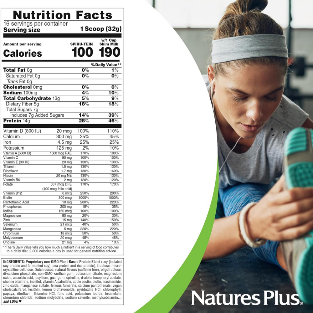 Vitamin D, Calcium, Iron, Potassium, Vitamin A, Vitamin C, Vitamin E, Thiamin, Riboflavin, Niacin, Vitamin B6, Folate (folic acid), Vitamin B12, Biotin, Pantothenic Acid, Phosphorus, Iodine, Magnesium, Zinc, Selenium, Manganese, Chromium, Molybdenum, Choline. Other ingredients: Proprietary non-GMO Plant-Based Protein Blend [soy (isolated soy protein and fermented soy), pea protein and rice protein], fructose, microcrystalline cellulose, Dutch cocoa, natural flavors (caffeine free), oligofructose, di-calcium phosphate, non-GMO xanthan gum, potassium citrate, magnesium oxide, ascorbic acid, psyllium, guar gum, spirulina, d-alpha tocopheryl acetate, choline bitartrate, inositol, vitamin A palmitate, apple pectin, biotin, niacinamide, zinc oxide, manganese sulfate, ferrous fumarate, calcium pantothenate, vegan cholecalciferol, lecithin, lemon bioflavonoids, pyridoxine HCI, chlorophyll, papaya, riboflavin, thiamine HCI, folic acid, potassium iodide, bromelain, chromium chloride, sodium molybdate, sodium selenite, methylcobalamin.