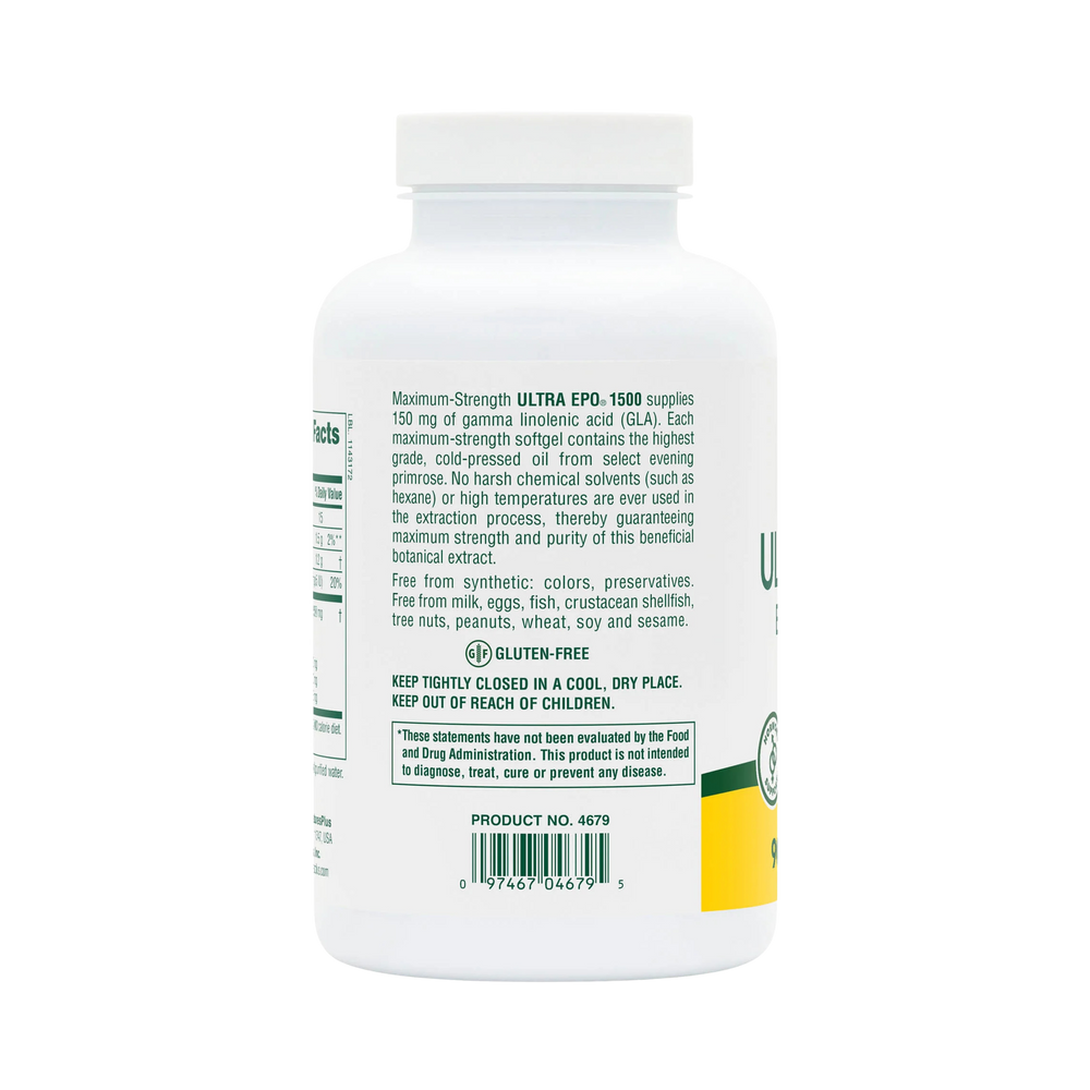 Maximum-Strength ULTRA EPO® 1500 supplies 150 mg of gamma linolenic acid (GLA). Each maximum-strength softgel contains the highest grade, cold-pressed oil from select evening primrose. No harsh chemical solvents (such as hexane) or high temperatures are ever used in the extraction process, thereby guaranteeing maximum strength and purity of this beneficial botanical extract.