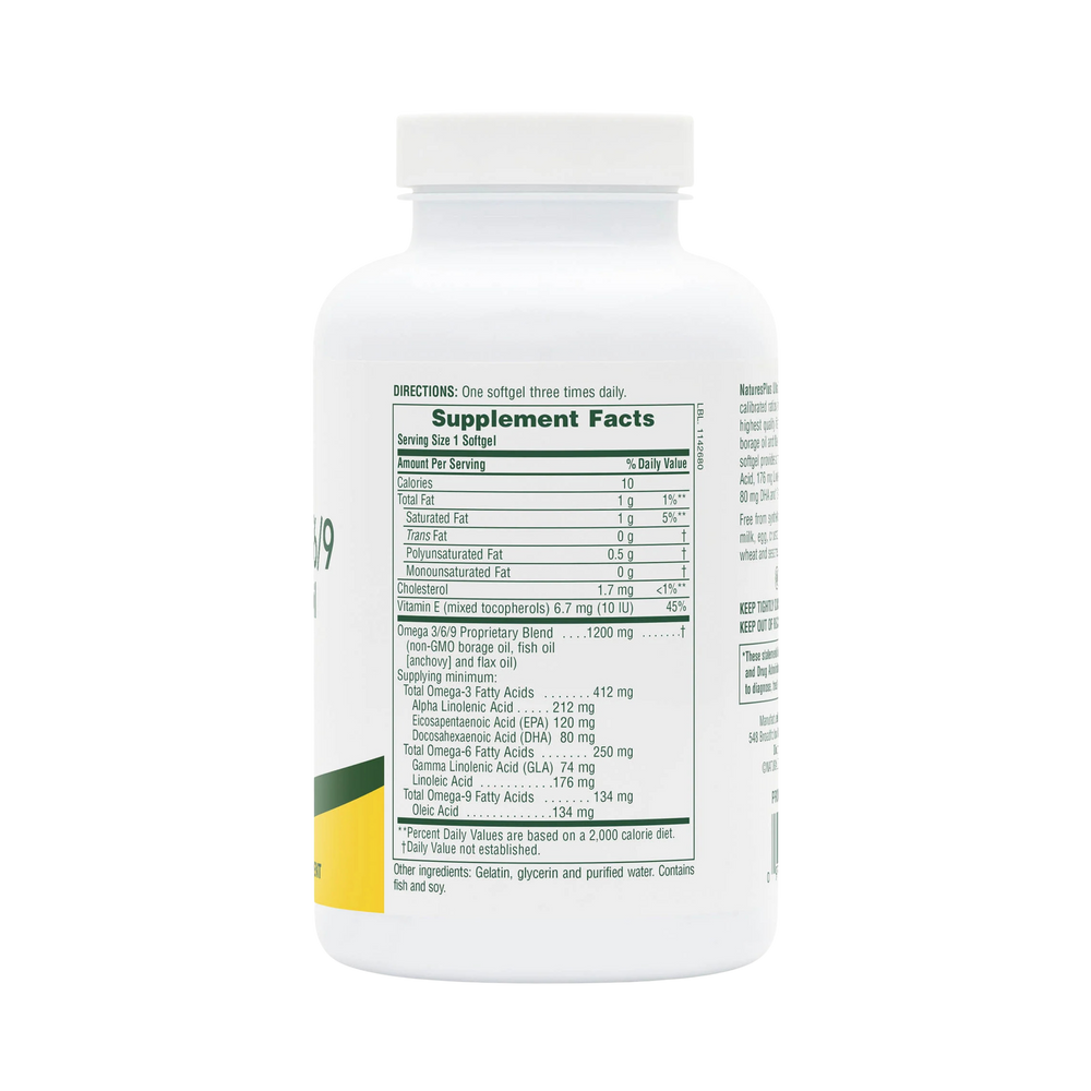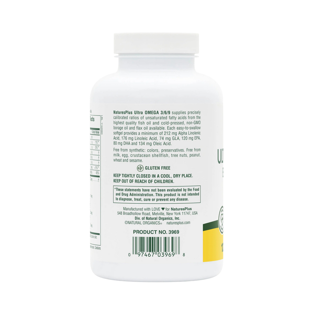 NaturesPlus Ultra OMEGA 3/6/9 supplies precisely calibrated ratios of unsaturated fatty acids from the highest quality fish oil and cold-pressed, non-GMO borage oil and flax oil available. Each easy-to-swallow softgel provides a minimum of 212 mg Alpha Linolenic Acid, 176 mg Linoleic Acid, 74 mg GLA, 120 mg EPA, 80 mg DHA and 134 mg Oleic Acid.