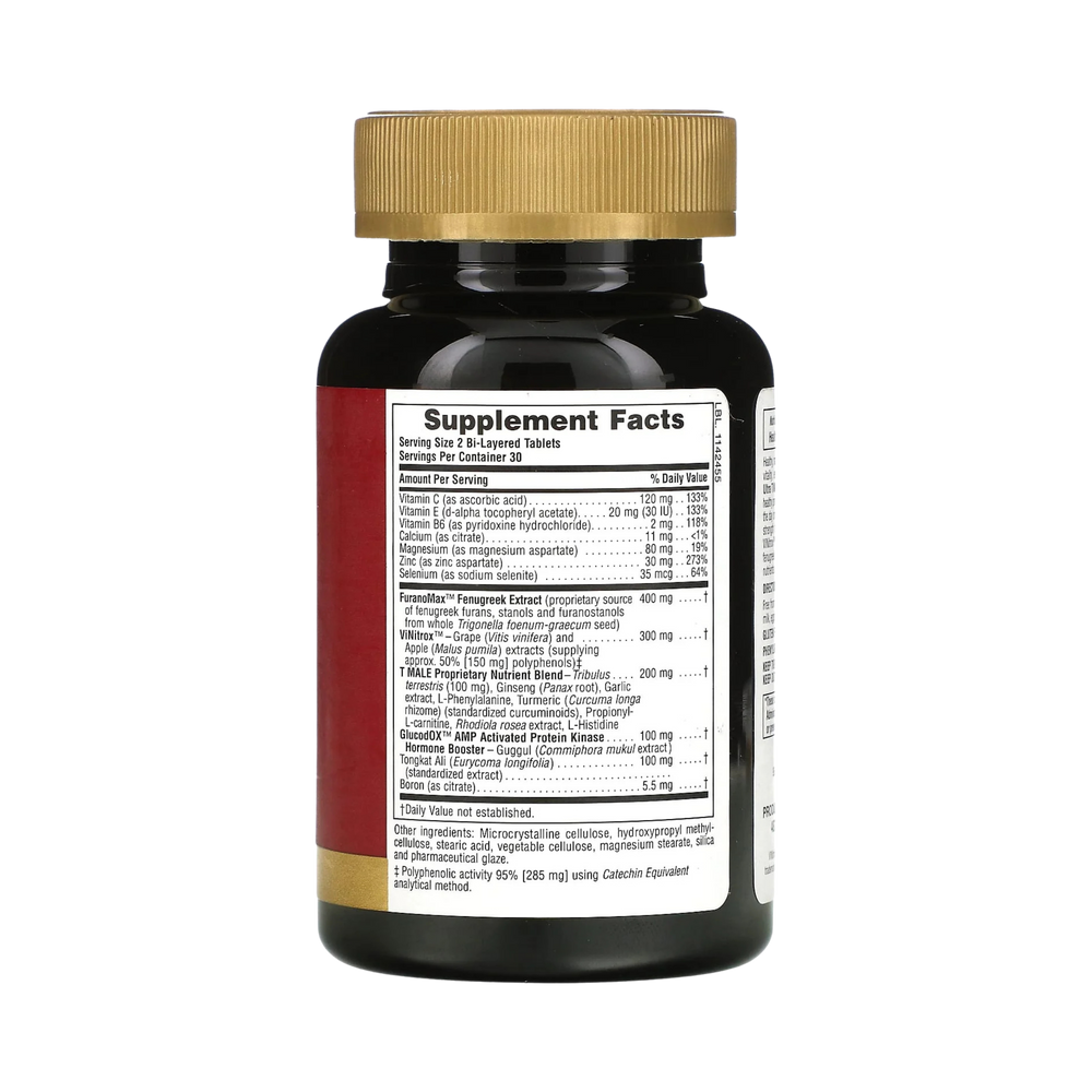 Healthy, natural testosterone levels promote strength, endurance, stamina, vitality, energy, brain function, mood, sexual function and more. Ultra T Male® dual-action Bi-Layered Tablets help nutritionally maximize healthy production of revitalizing testosterone, immediately and throughout the day or night. The rapid-release layer delivers powerful maximum-strength testosterone-revving nutrients: GlucodOX™ AMPK Booster, ViNitrox™ fruit polyphenols, Tongkat Ali, high potency zinc, calcium and fenugreek. The extended release layer delivers the same powerful nutrients over the next 10 hours for long-lasting nutritional benefits.