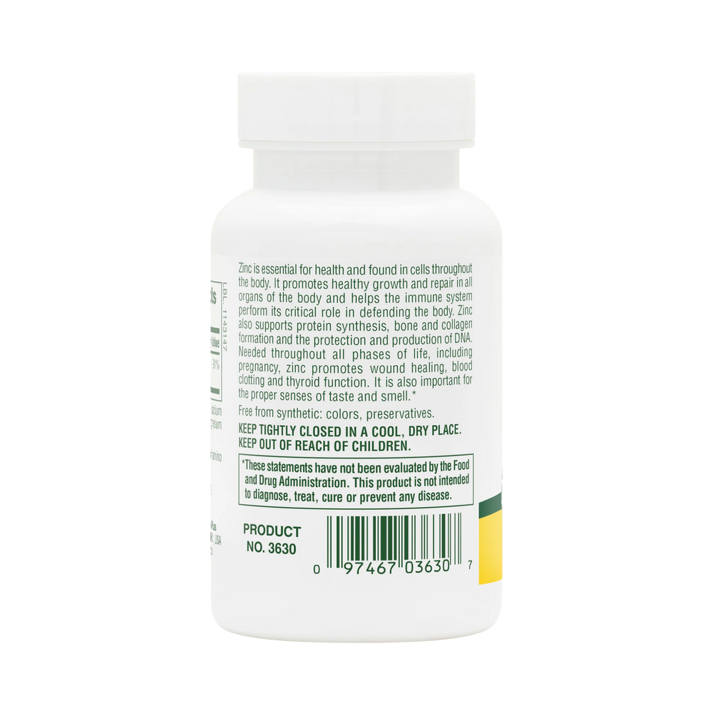 Zinc is essential for health and found in cells throughout the body. It promotes healthy growth and repair in all organic of the body and helps the immune system perform its critical role in defending the body. Zinc also supports protein synthesis, bone and collagen formation and the protection and production of DNA. Needed throughout all phases of life, including pregnancy, zinc promotes wound healing, blood clotting and thyroid function. It is also important for the proper senses of taste and smell.