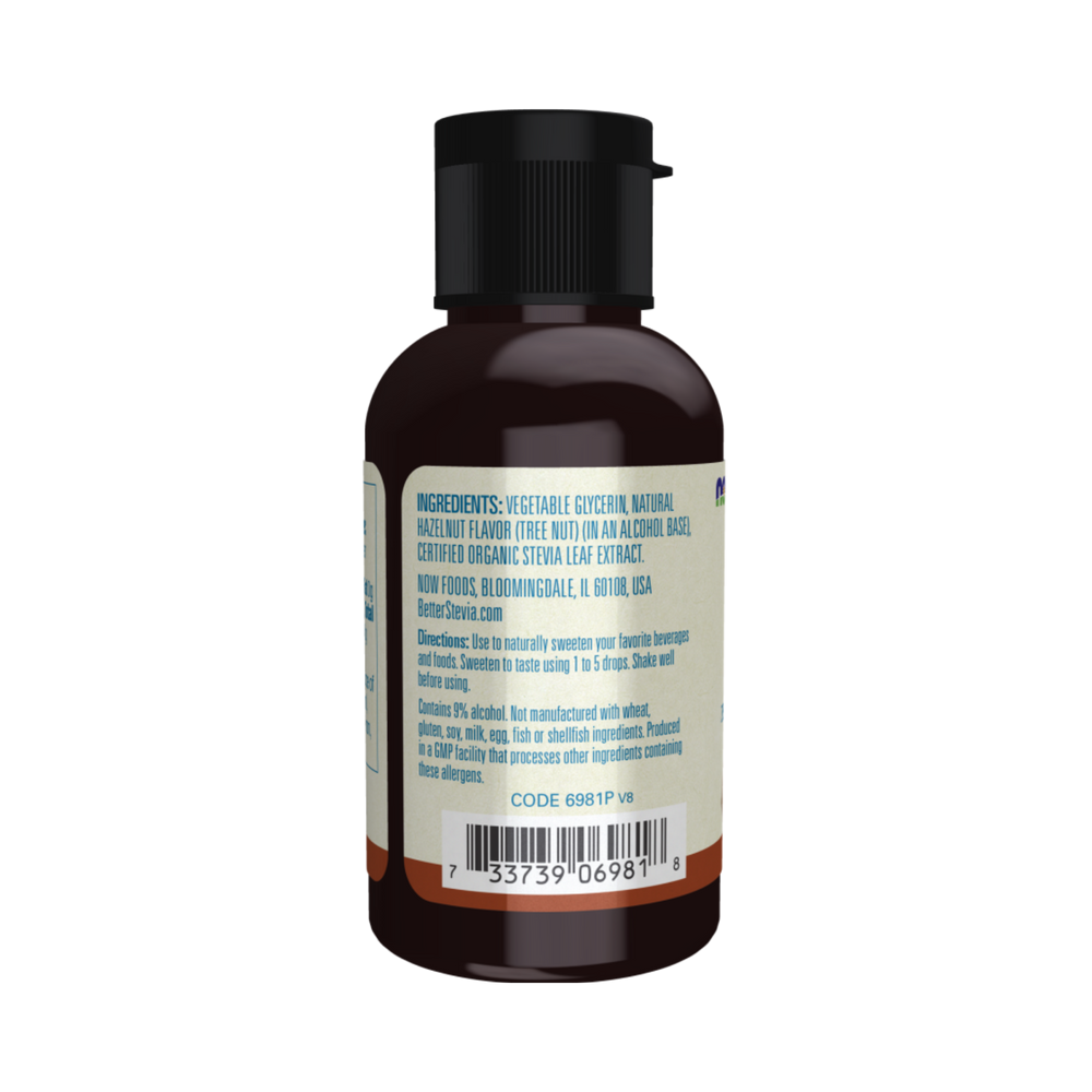 Vegetable glycerin, natural hazelnut flavor (tree nut) (in an alcohol base), certified organic stevia leaf extract.