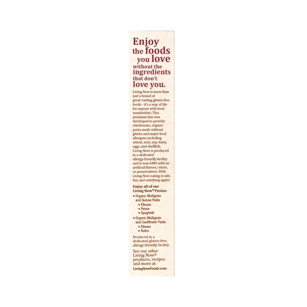 Living Now is more than just a brand of great-tasting gluten-free foods - it's a way of life for anyone with food sensitivities. This premium line was developed to provide wholesome, organic pasta made without gluten and major food allergens including wheat, nuts, soy, dairy, eggs, and shellfish. Living Now is produced in a dedicated allergy-friendly facility and is non-GMO with no artificial flavors, colors, or preservatives. With Living Now eating is safe, fun, and satisfying again!