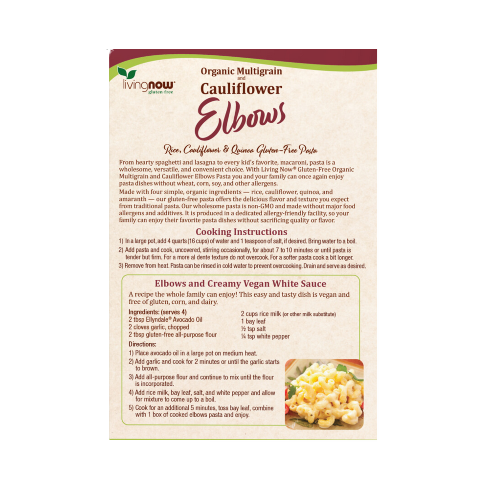 From hearty spaghetti and lasagna to every kid's favorite, macaroni, pasta is a wholesome, versatile, and convenient choice. With Living Now® Gluten-Free Organic Multigrain and Cauliflower Elbows Pasta you and your family can once again enjoy pasta dishes without wheat, corn, soy, and other allergens.