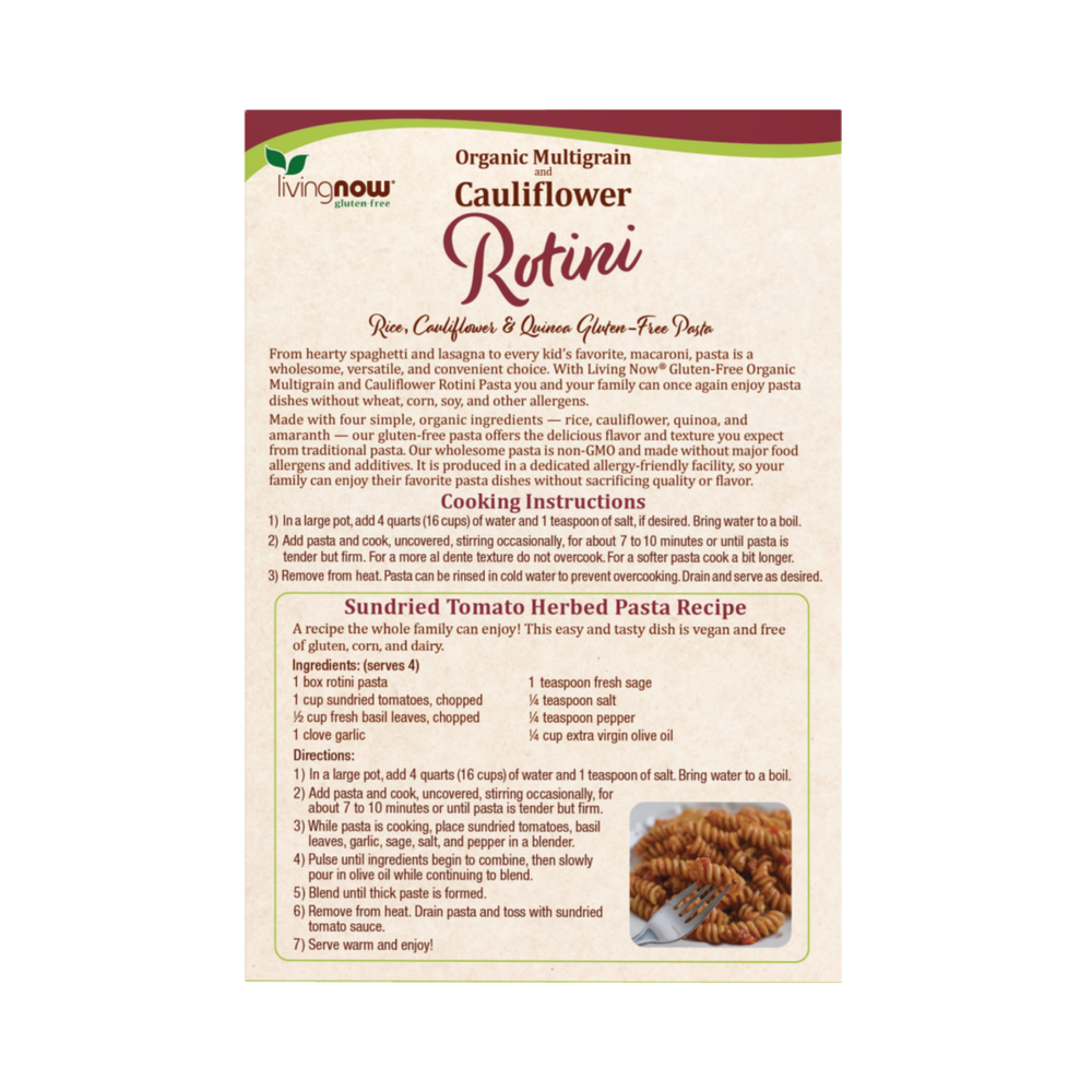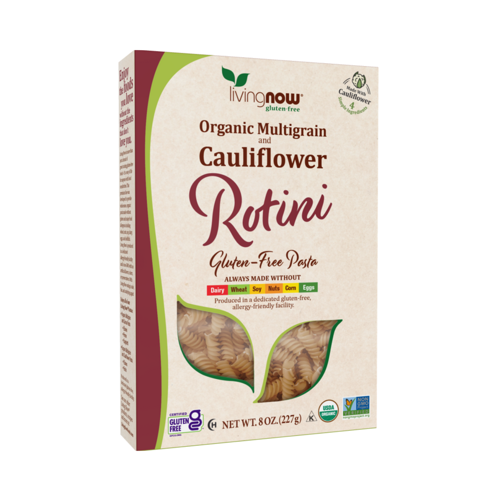 From hearty spaghetti and lasagna to every kid's favorite, macaroni, pasta is a wholesome, versatile, and convenient choice. With Living Now® Gluten-Free Organic Multigrain and Cauliflower Rotini Pasta you and your family can once again enjoy pasta dishes without wheat, corn, soy, and other allergens.