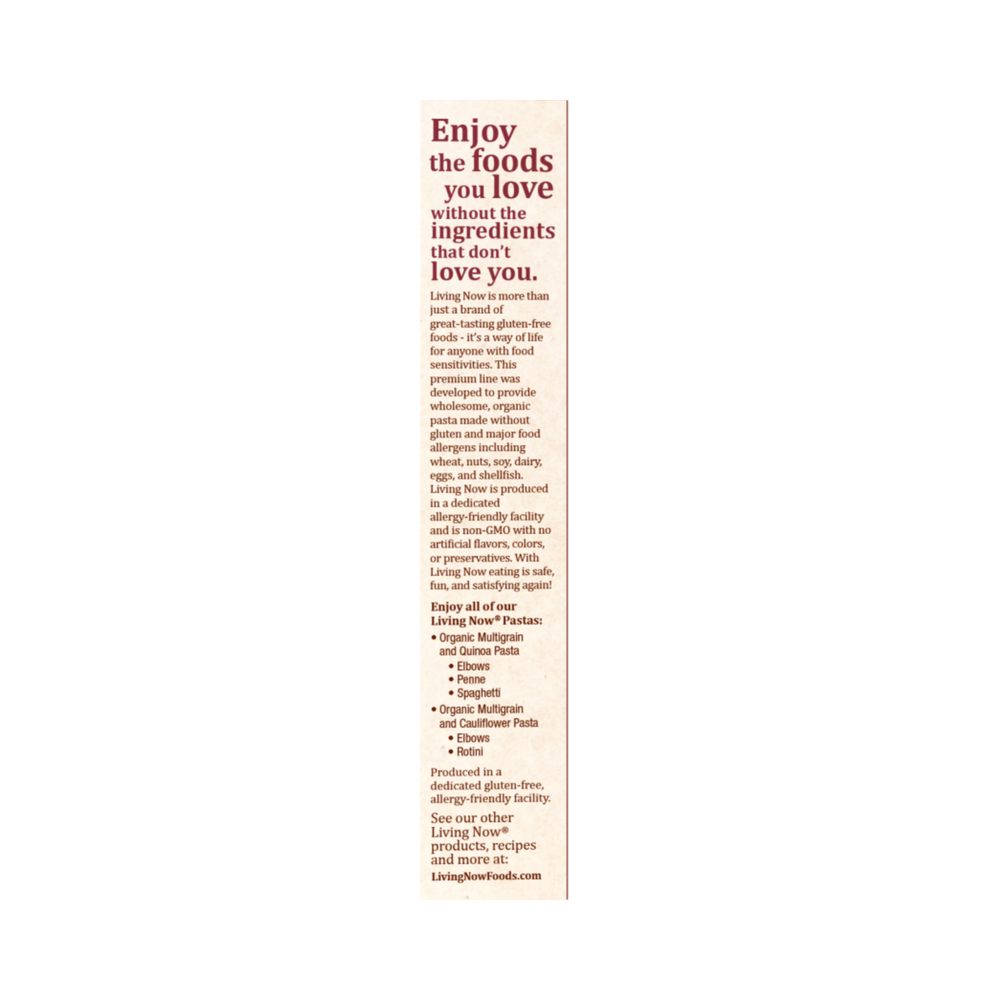 Living Now is more than just a brand of great-tasting gluten-free foods - it's a way of life for anyone with food sensitivities. This premium line was developed to provide wholesome, organic pasta made without gluten and major food allergens including wheat, nuts, soy, dairy, eggs, and shellfish. Living Now is produced in a dedicated allergy-friendly facility and is non-GMO with no artificial flavors, colors, or preservatives. With Living Now eating is safe, fun, and satisfying again!