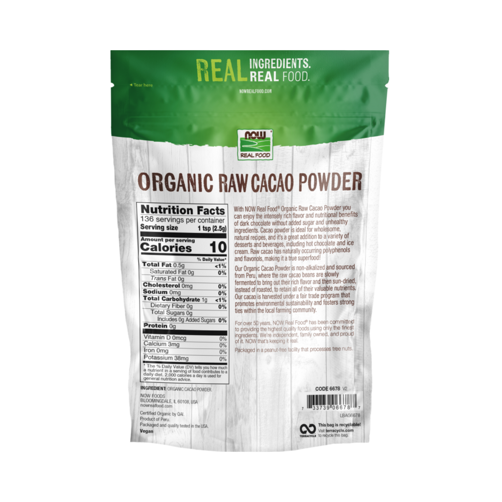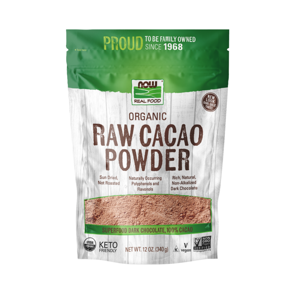 With NOW Real Food® Organic Raw Cacao Powder you can enjoy the intensely rich flavor and nutritional benefits of dark chocolate without added sugar and unhealthy ingredients. Cacao powder is ideal for wholesome, natural recipes, and it’s a great addition to a variety of desserts and beverages, including hot chocolate and ice cream. Raw cacao has naturally occurring polyphenols and flavonols, making it a true superfood!