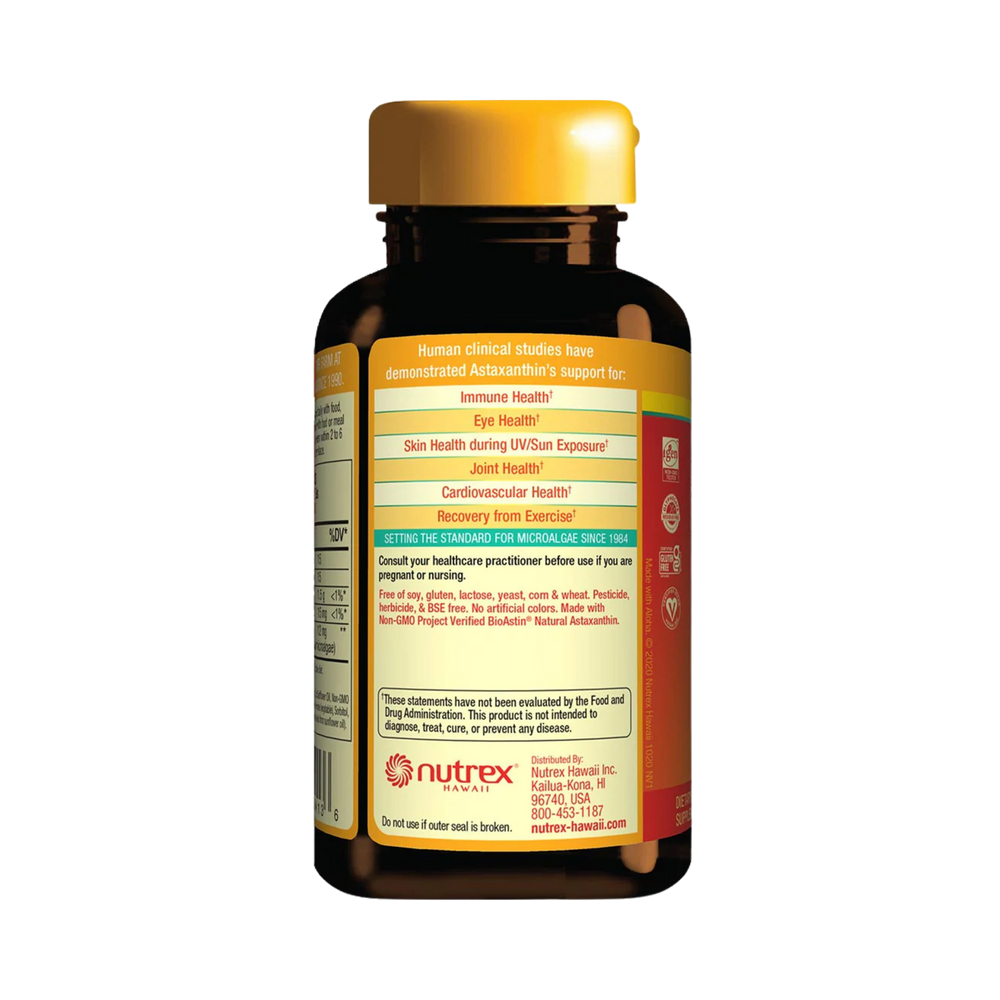 Natural Hawaiian Astaxanthin (from Haematococcus pluvialis microalgae), Other Ingredients: Extra Virgin Oil, High Oleic Safflower Oil, Non-GMO modified cornstarch, Seaweed, Glycerine (vegetable), Sorbitol, Purified Water, Natural Tocopherols (from Sunflower Oil), Also contains naturally occuring carotenoids including lutein in a synergistic blend.