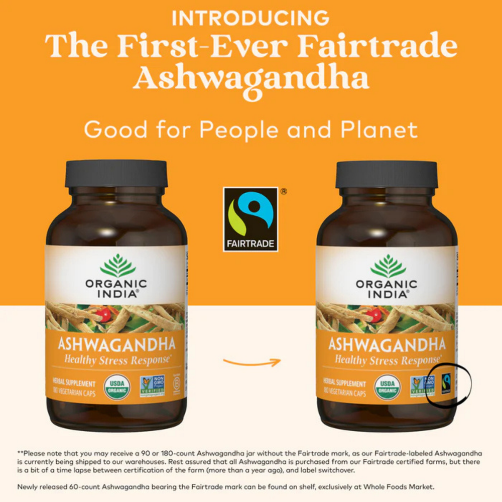 Ashwagandha (Withania somnifera) root: Fairtrade certified and sourced from Fairtrade Producers. Total 100%, excluding the capsule.