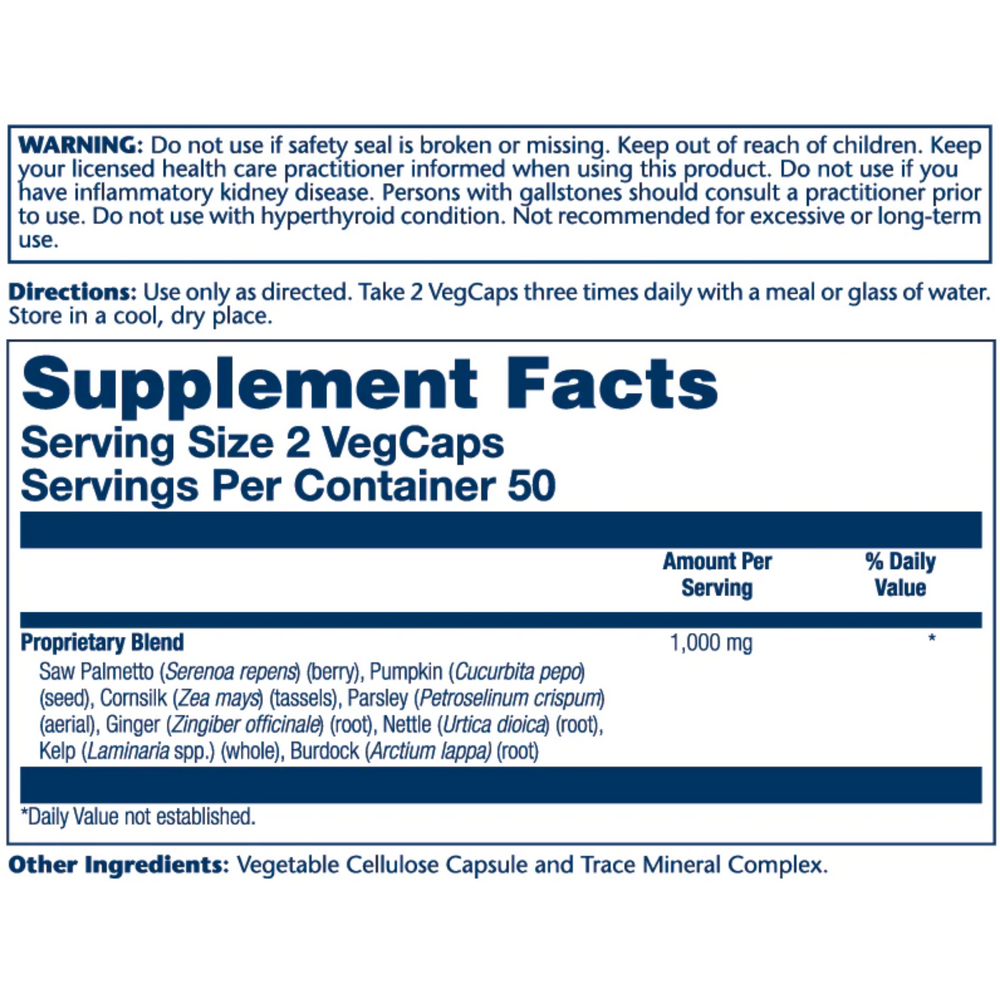 | Proprietary Blend Saw Palmetto (Serenoa repens) (berry), Pumpkin (cucurbita pepo) (seed), Cornsilk (Zea Mays) (tassels), Parsley (Petroselinum crispum) (aerial), Ginger (Zingiber officinale) (root), Nettle (Urtica dioica) (root), Kelp (Laminaria spp.) (whole), Burdock (Arctium lappa) (root) |