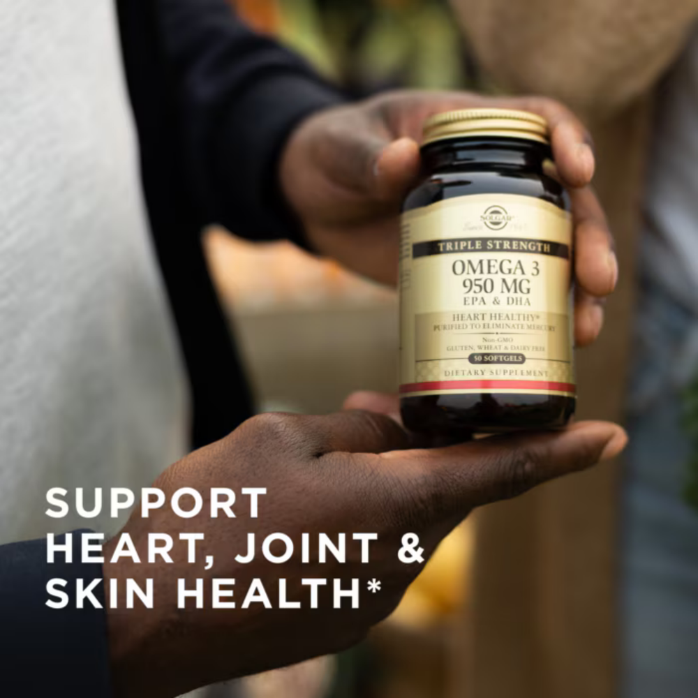 Omega 3 950 mg is Solgar's highest concentration of the natural Omega 3 polyunsaturates EPA and DHA from cold-water fish. This formulation supports cardiovascular, joint and skin health. It is molecularly distilled to remove mercury.