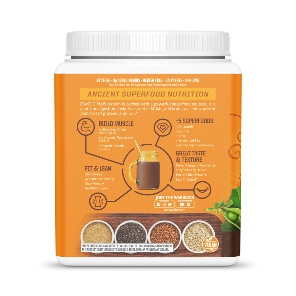 Classic Plus protein is packed with 5 powerful superfood sources. It is gentle on digestion, includes essential BCAAs, and is an excellent source of plant-based proteins and iron.