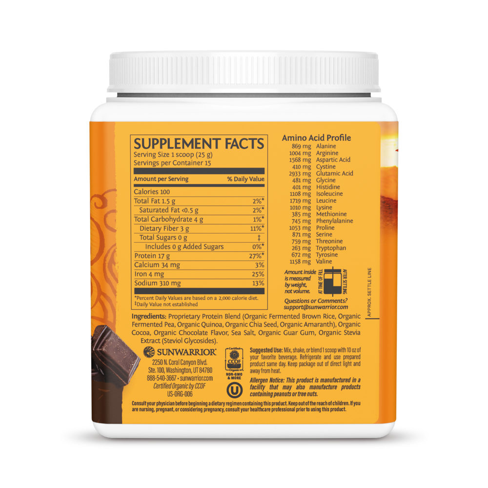 Proprietary protein blend (organic fermented brown rice, organic fermented pea, organic quinoa, organic chia seed, organic amaranth), organic cocoa, organic chocolate flavor, sea salt, organic guar gum, organic stevia extract (steviol glycosides).