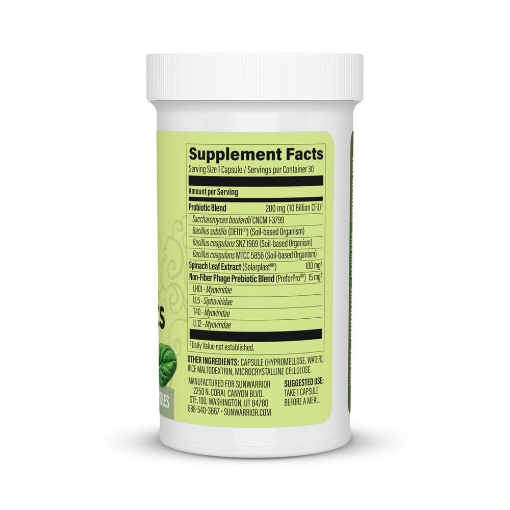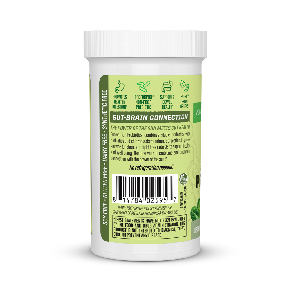 Sunwarrior Probiotics combine stable probiotics with prebiotics and chloroplasts to enhance digestion, improve enzyme function, and fight free radicals to support health and well-being. Restore your microbiome and gut-brain connection with the power of the sun!
