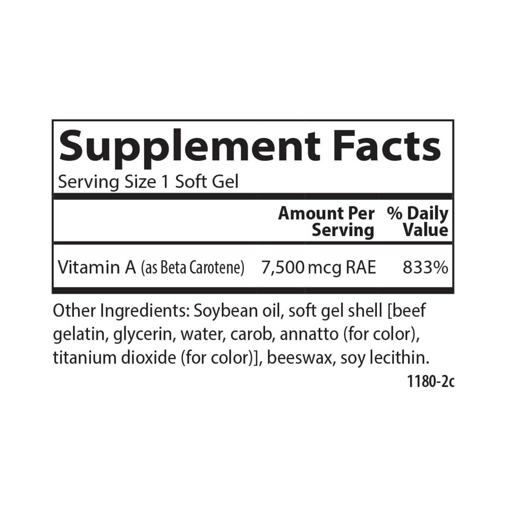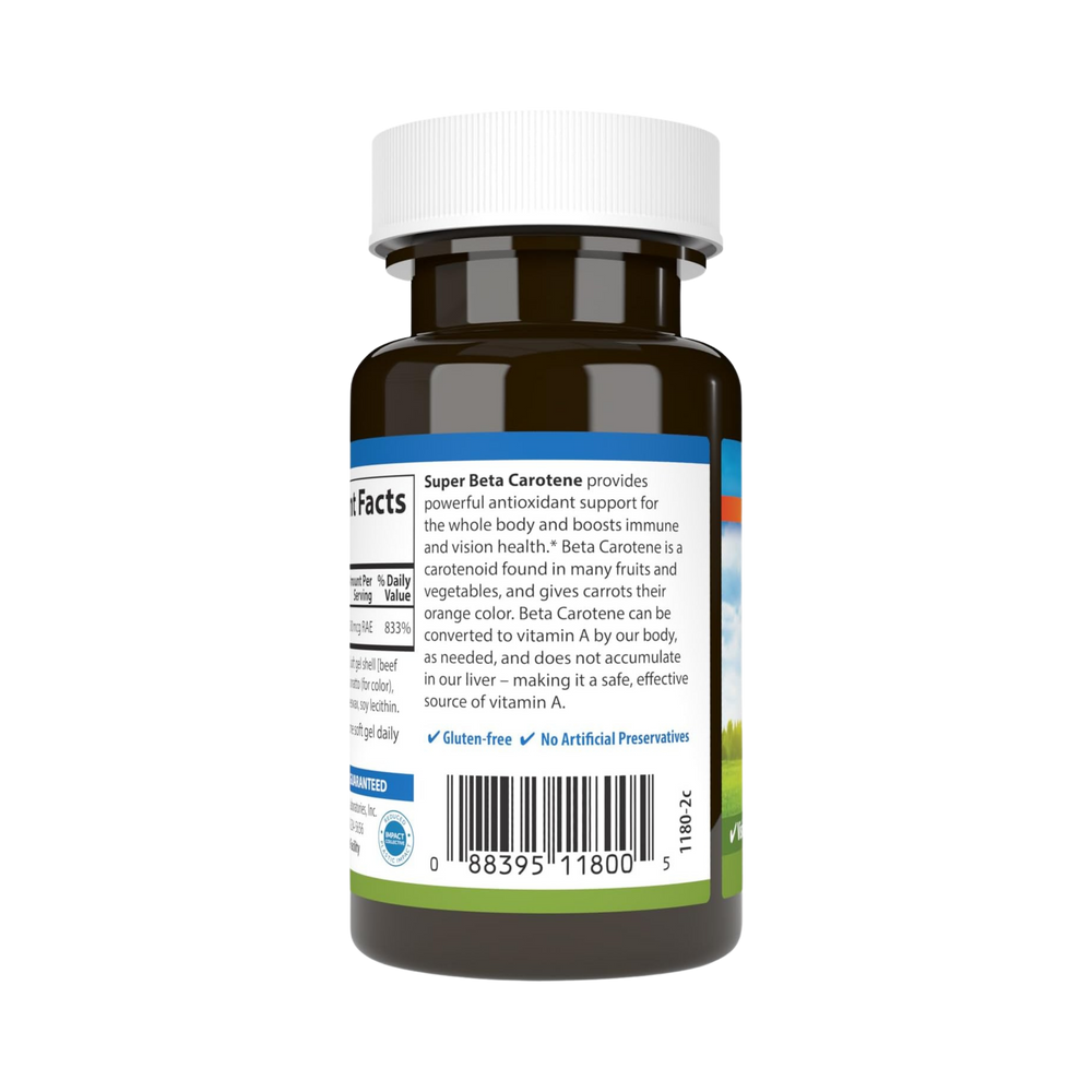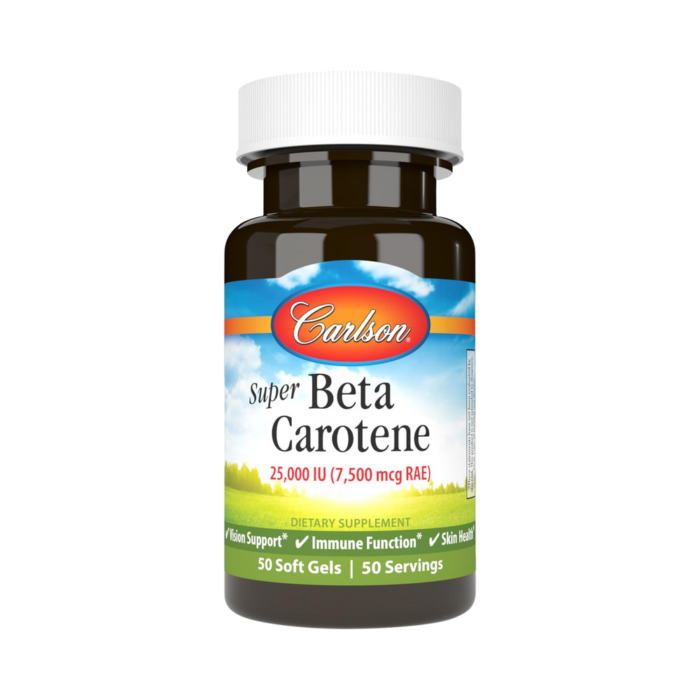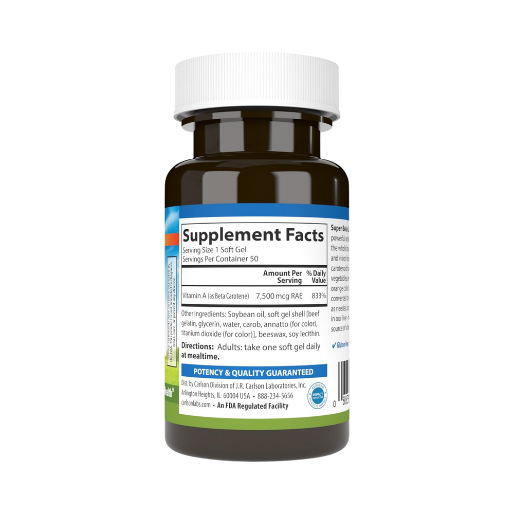 Beta carotene is an important antioxidant in the body that also acts as a source of vitamin A. As a precursor to vitamin A, beta carotene is only converted as needed, making it a safe vitamin A source in higher doses. Carlson Super Beta Carotene contains 100% natural beta carotene and no synthetic beta carotene. Natural beta carotene has been shown to be more bioavailable and bioactive than synthetic beta carotene in the human body.