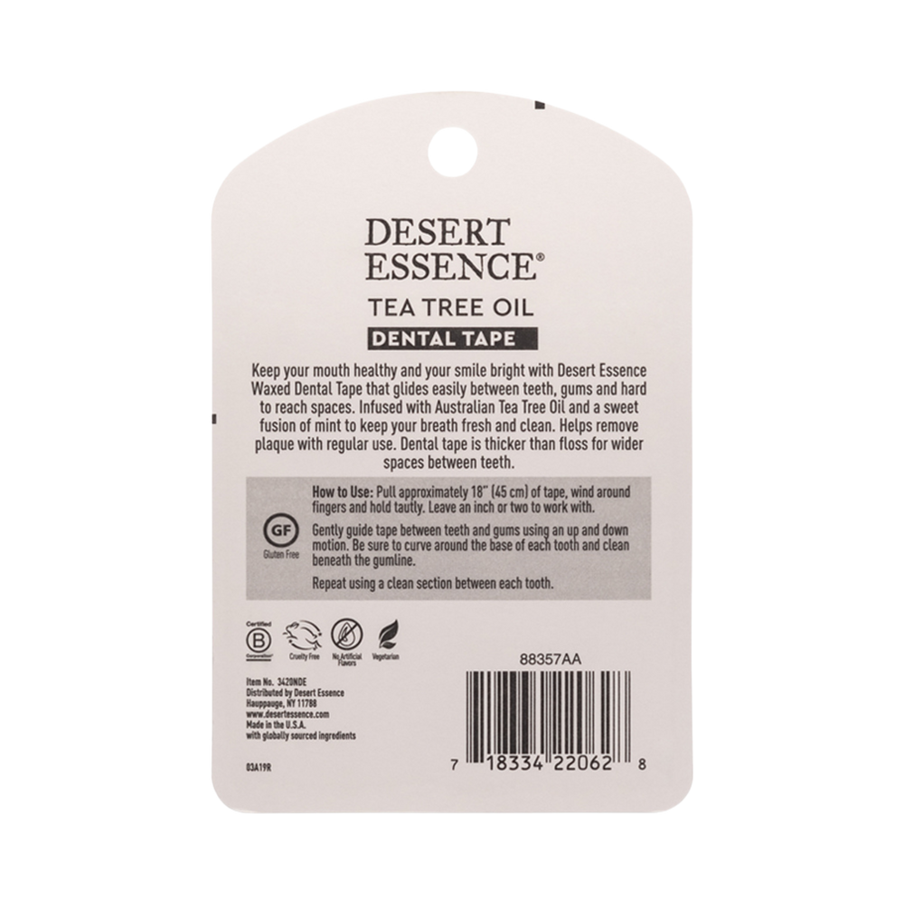 This naturally waxed dental tape floss has a thicker width which enables it to thoroughly cleanse wider spaces between teeth, gliding smoothly between gums and hard-to-reach spaces. Australian Tea Tree Oil lends its powerful cleansing benefits, while Mint Essential Oil keeps breath fresh and clean.