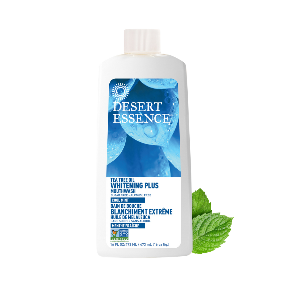 Sugar and alcohol-free teeth whitening mouthwash formulated with Bamboo Juice, Horsetail and Pure Australian Eco-Harvest® Tea Tree Oil. Whitening formula deeply cleanses, helps brightens teeth, and freshens breath with a cool burst of Spearmint and Wintergreen Oils.